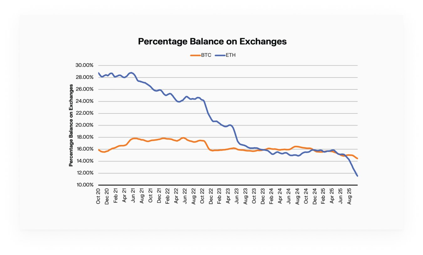 Auffällig ist, dass die Bestände beider Coins auf Exchanges sinken. Bei Bitcoin beläuft sich der Rückgang auf 1,5 Prozent, bei Ethereum auf fast 18 Prozent. Die Verschiebung hin zu Spot-ETFs und professionellen Custodians gilt Analysten als struktureller Wandel. Dadurch ähnelt Bitcoin immer mehr einem digitalen Sparprodukt, während Ethereum als Rückgrat der Onchain-Aktivitäten dient.