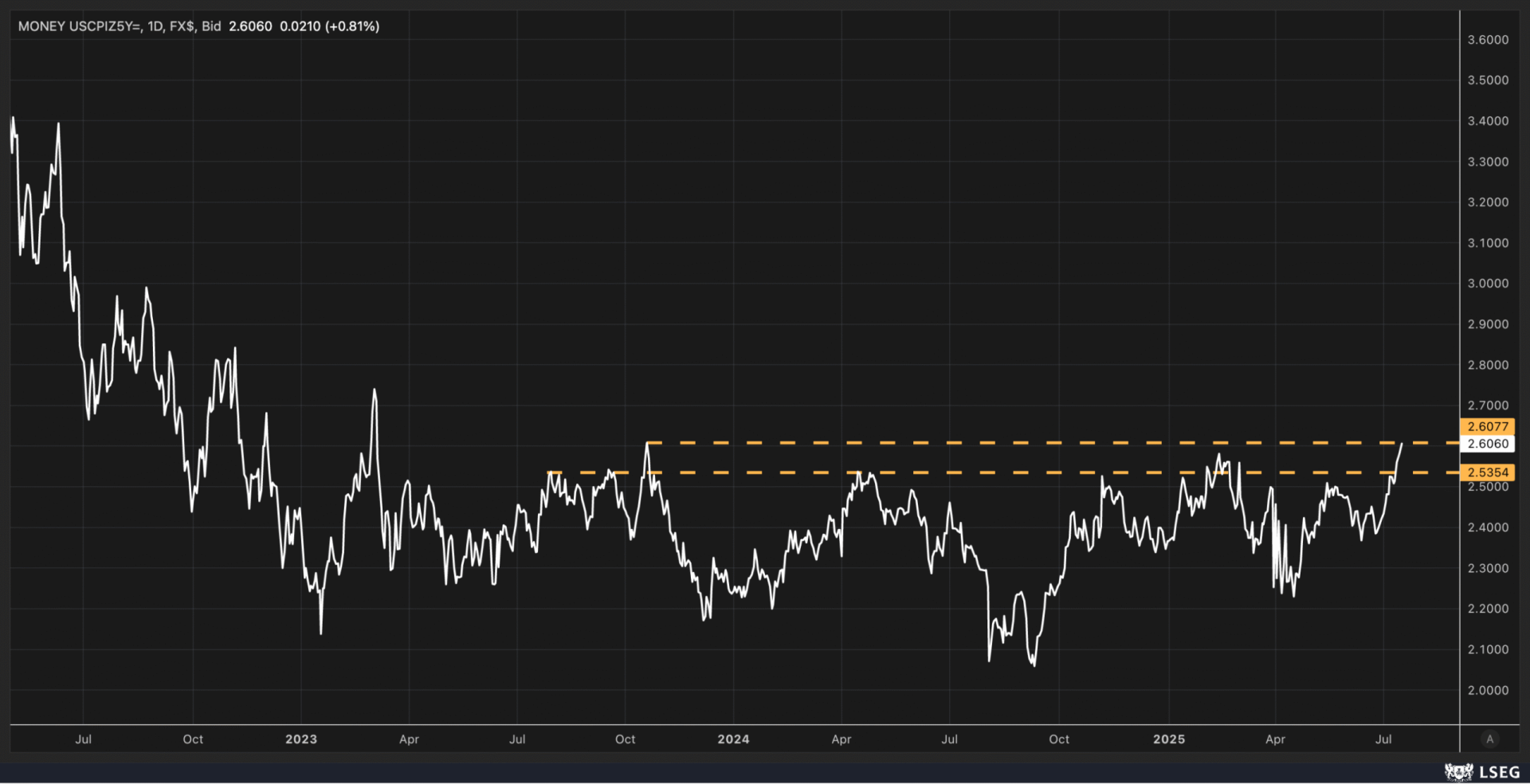Weiterhin sieht Kramer, dass die Inflationserwartungen auf dem Markt steigen. Auch wenn wir auf die längere Frist blicken. Die Inflationsswaps für über fünf Jahre liegen bei 2,6 Prozent und scheinen einen Ausbruch zu erleben.
