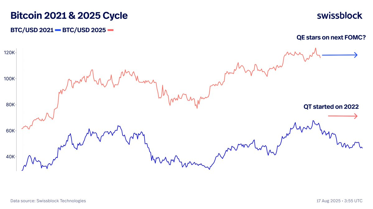 Laut Swissblock besteht dieses Risiko auch jetzt, doch der breitere wirtschaftliche Kontext weist auf ein anderes Ergebnis hin. 2021 begann Bitcoin zu fallen, als die US-Notenbank die Zinsen anhob und mit dem Abbau von Unterstützungsmaßnahmen begann. Nun könnte vielmehr das umgekehrte Szenario ins Spiel kommen, mit Zinssenkungen und möglicherweise neuem Aufkaufprogramm (Quantitative Easing).