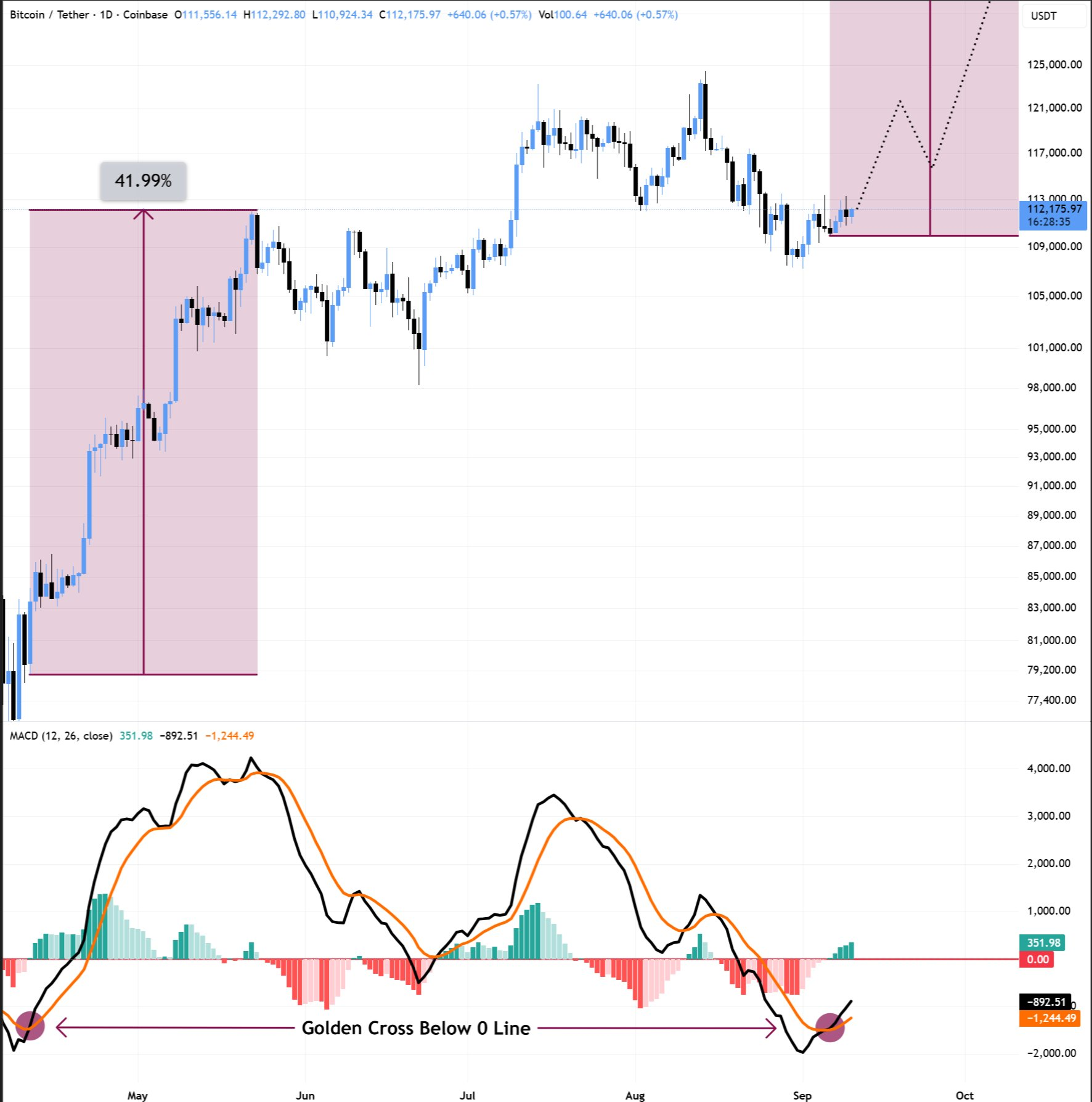 Ein auffälliges Kursmuster, das sogenannte MACD golden cross, ist laut Analyst BitBull einer der treibenden Kräfte hinter dem Optimismus. Dieses Muster erscheint selten unter der Nulllinie und geht historisch gesehen oft einer kräftigen Aufwärtsbewegung voraus.