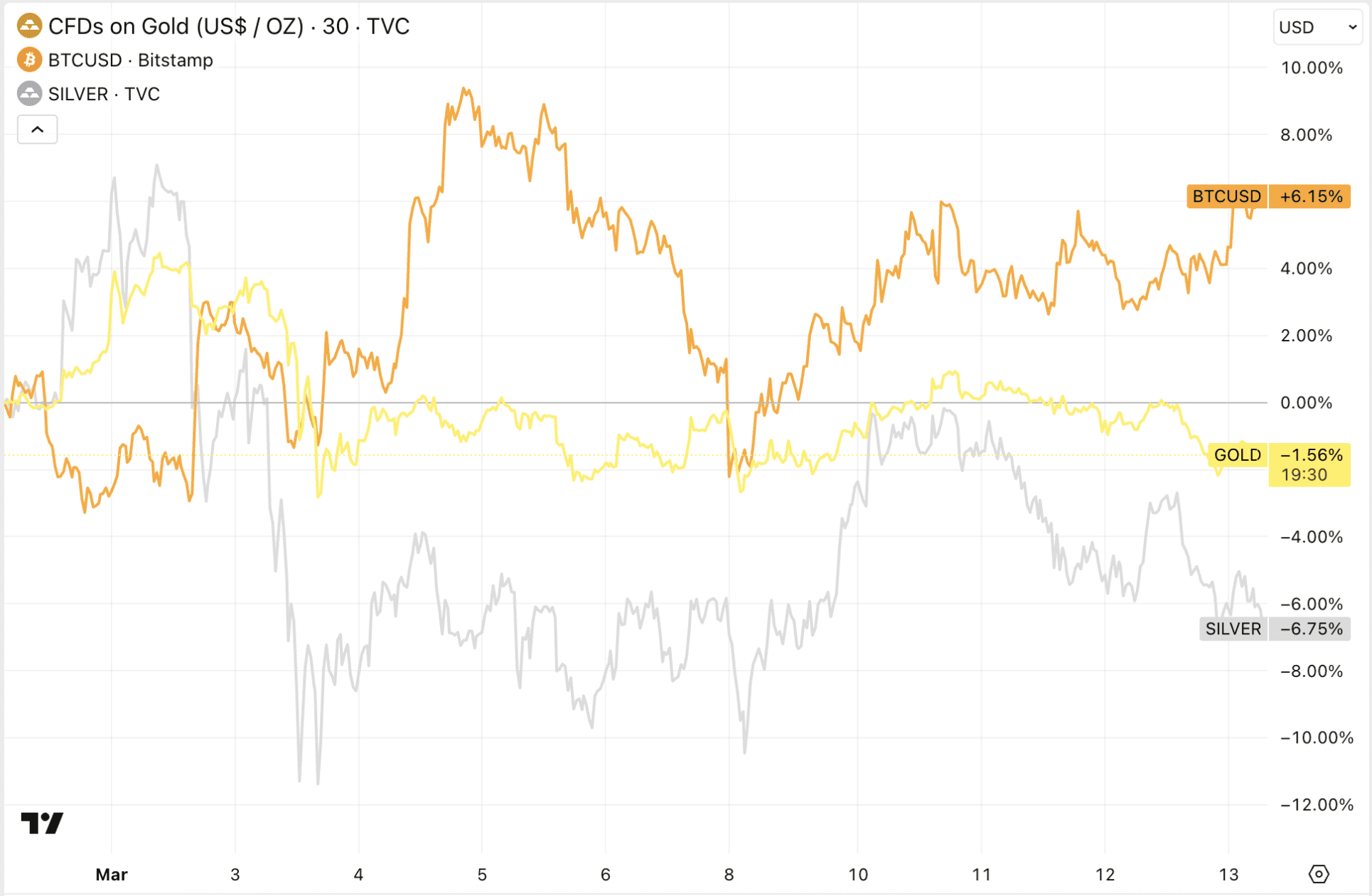 Ein weiterer möglicher Grund für die Erholung von Bitcoin gegenüber Gold könnten die ETF-Ströme sein. Für Bitcoin sind diese seit Kurzem wieder positiv, während Gold-ETFs am 6. März beispielsweise eine Abfluss von 3 Milliarden Dollar verzeichneten.