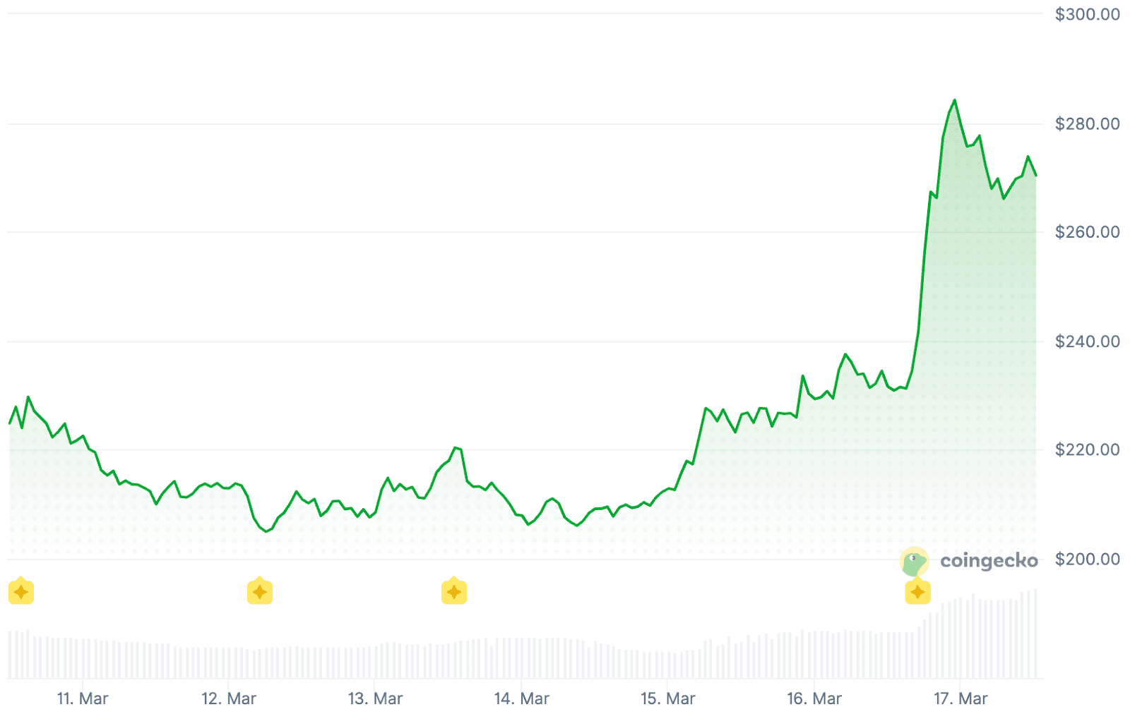 Zcash liegt zum Zeitpunkt des Schreibens bei etwa 272 Dollar. Zuvor erreichte der Coin heute kurzzeitig 277 Dollar. Gestern Abend näherte sich der Preis des Privacy-Tokens sogar fast der 290-Dollar-Marke.