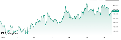 Die Dominanz von Bitcoin wächst stetig. Diese Kennzahl zeigt, welchen Anteil der gesamten Kryptomarkt Bitcoin ausmacht. Kurzzeitig stieg dieser Anteil über 60 Prozent, zum Zeitpunkt des Schreibens liegt er knapp darunter bei 59,87 Prozent.