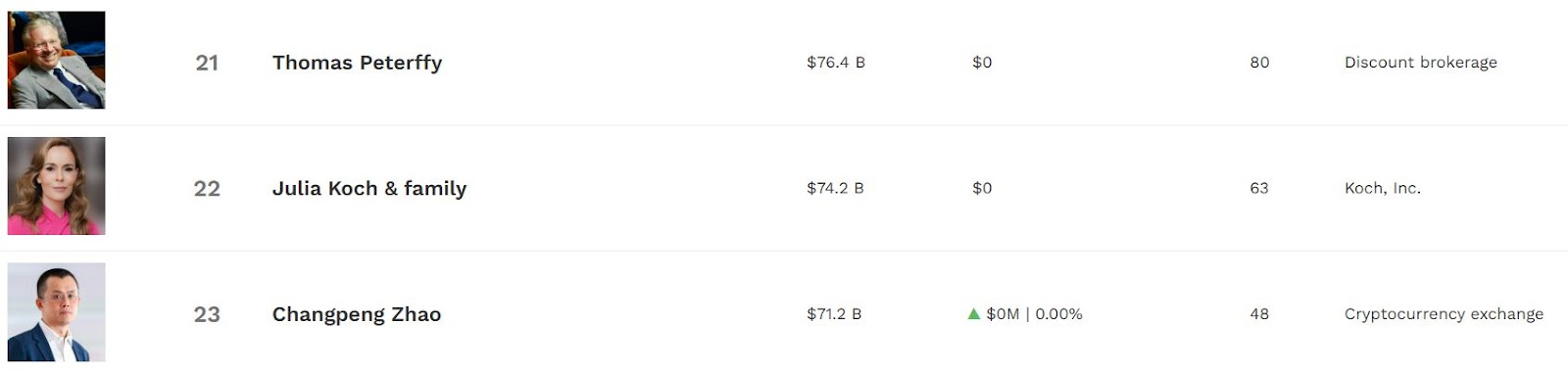Binance Mitbegründer Changpeng „CZ“ Zhao verfügt jetzt über ein Vermögen von mindestens 75 Milliarden Dollar, nachdem der BNB Token ein neues Allzeithoch von 850 Dollar erreichte. Damit gehört der Gründer von Binance nun zu den 23 reichsten Menschen auf der Erde. Im Februar teilte CZ noch mit, dass 98 Prozent seines Portfolios in BNB und 1,32 Prozent in Bitcoin liegen.