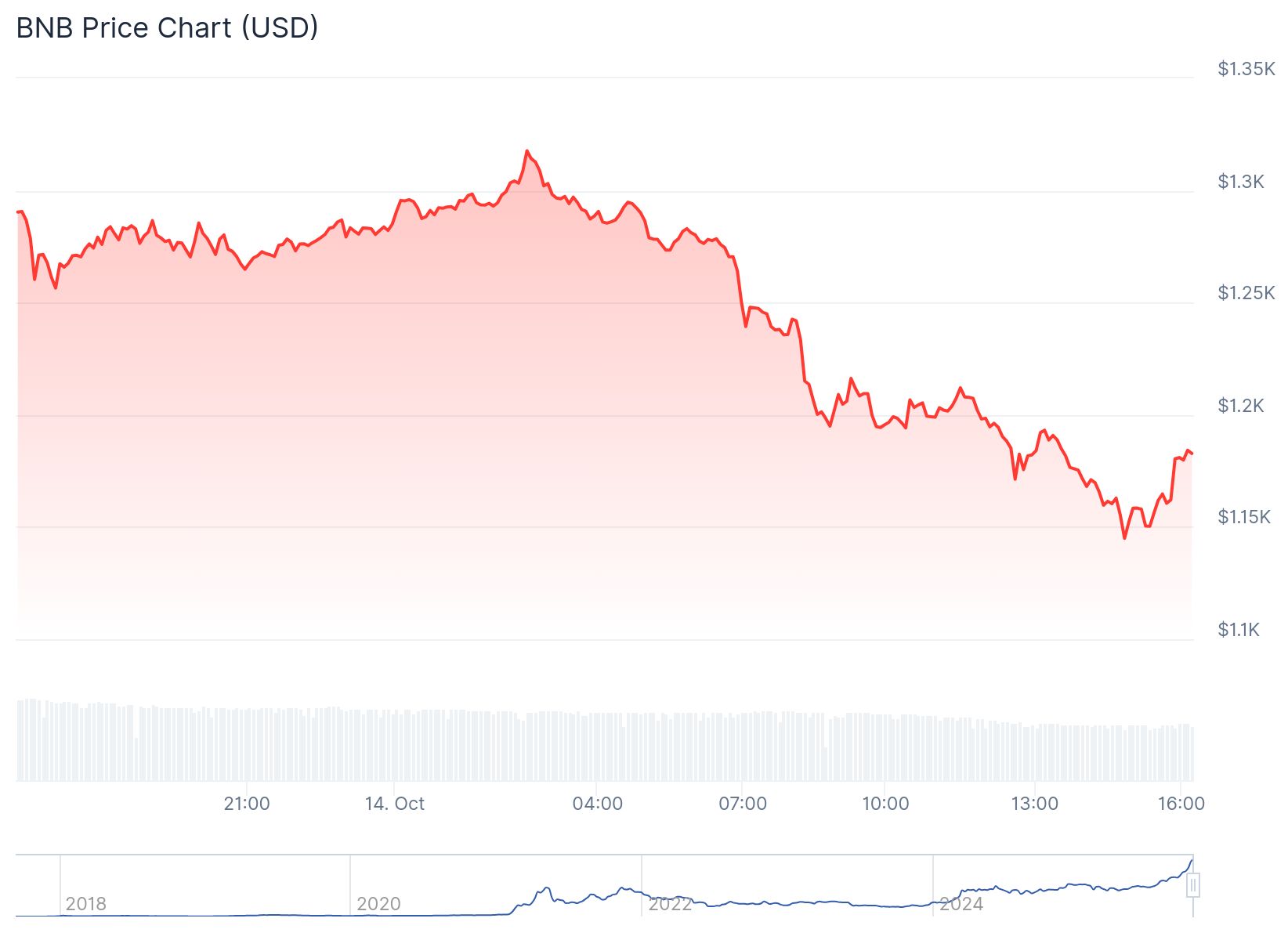 Auffällig ist, dass die gestiegene Netzwerkaktivität mit einem kräftigen Kursrückgang einhergeht. Am Montag markierte der BNB-Kurs noch ein neues Rekordhoch bei 1.370 Dollar. Inzwischen ist der Preis um rund 15 Prozent gefallen und rutscht in Richtung 1.160 Dollar.