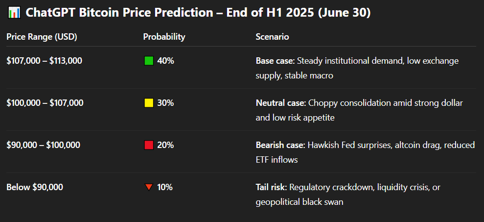 Wie steht Bitcoin am Ende dieses Monats da? ChatGPT wurde diese Frage gestellt. Basierend auf Kursdaten, Investorenverhalten und makroökonomischen Signalen entwirft das Modell vier mögliche Szenarien für den 30. Juni 2025.