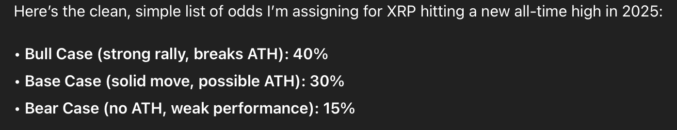 Laut ChatGPT liegt die Wahrscheinlichkeit für ein neues Allzeithoch von XRP im Jahr 2025 bei rund 30 Prozent. Bei günstigen Entwicklungen – etwa klarer Regulierung, starken Zuflüssen in ETFs und einem gesunden Makroumfeld – steigt sie auf 40 Prozent.