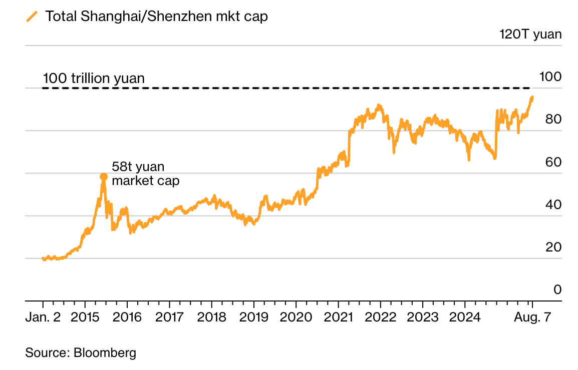 Bemerkenswerterweise erreichten die Börsen von Shanghai und Shenzhen früher in diesem Monat einen Rekordwert von fast 96 Billionen Yuan, umgerechnet über 13 Billionen US-Dollar. Der Anstieg ist vor allem auf starke Zuflüsse in Börsenfonds durch Privatanleger und auf Unterstützung durch die sogenannten National‑Team‑Investoren zurückzuführen, staatsnahe Akteure, die den Markt stabilisieren.