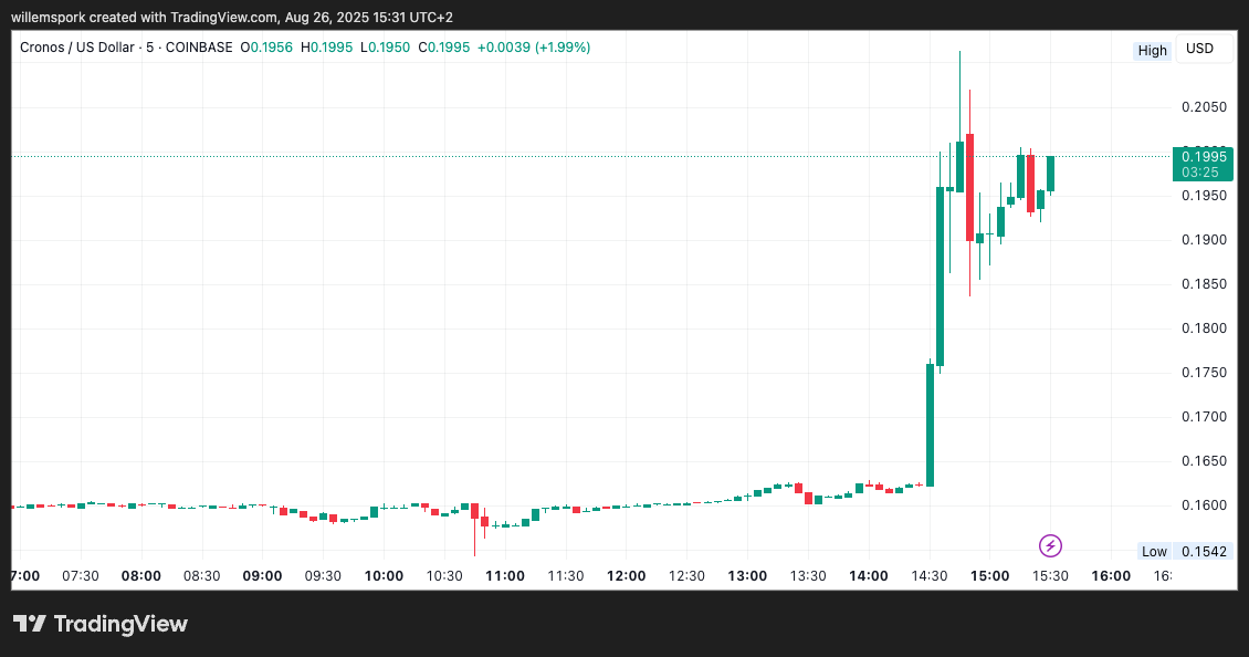Der Kurs von Cronos (CRO), dem Token des Crypto.com-Ökosystems, machte am Dienstag einen enormen Sprung. Innerhalb kurzer Zeit stieg die Münze um mehr als 25% auf einen Höhepunkt von $0,21. Damit steht CRO, derzeit die 23. größte Kryptowährung nach Marktkapitalisierung, wieder voll im Rampenlicht.