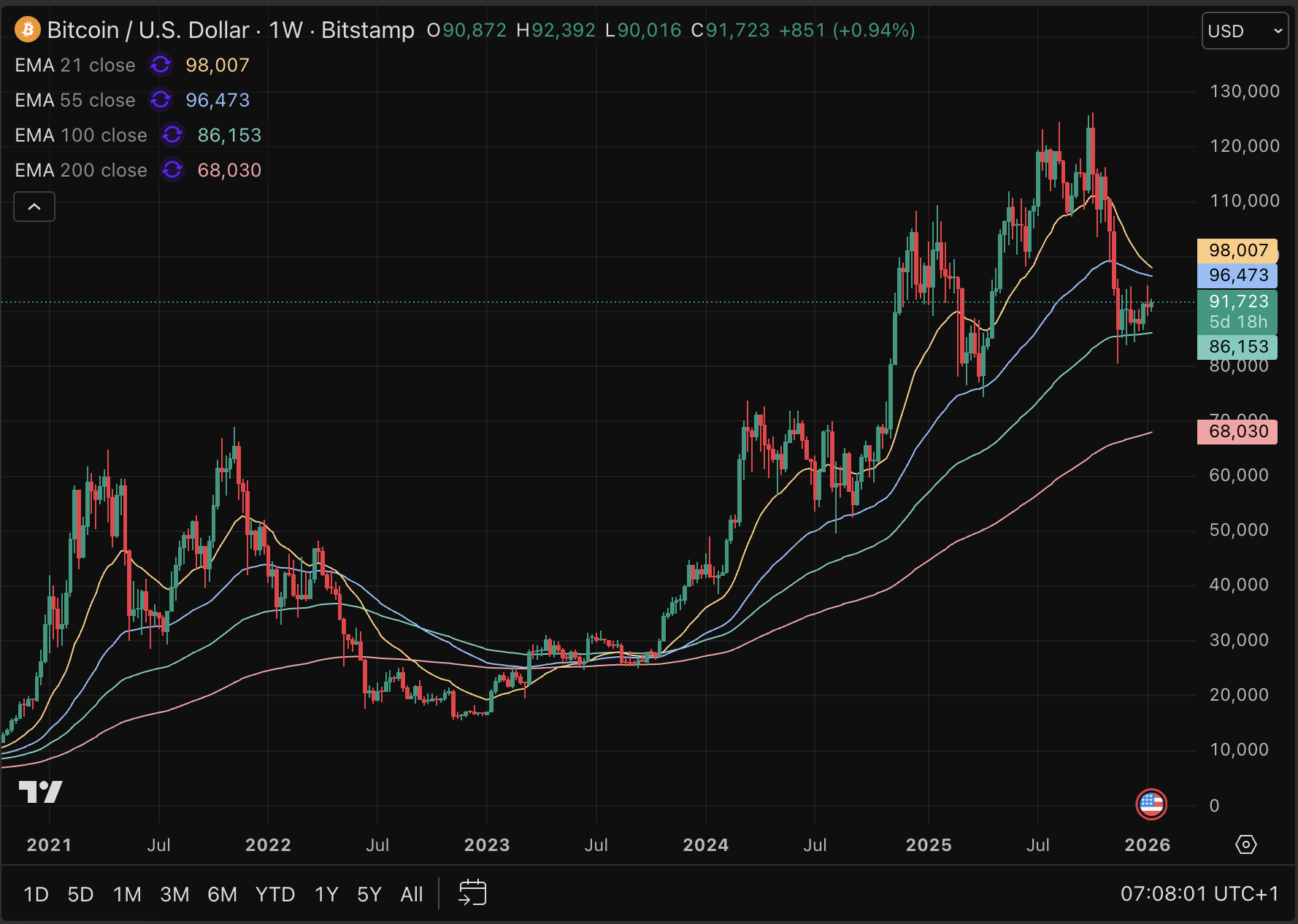 Was die Kursentwicklung von Bitcoin betrifft, sieht es zunehmend positiv für die digitale Währung aus. Der Kursrückgang auf etwa 80.000 Dollar gegen Ende 2025 scheint immer mehr die Basis der Korrektur zu sein. Somit dürfen die Optimisten vorsichtig wieder nach oben blicken, während der 100-Wochen-EMA (grüne Linie) als Unterstützung für Bitcoin dient.