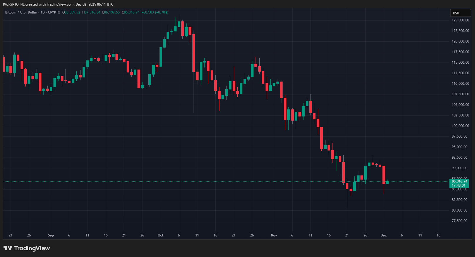 Stand jetzt hat der Bitcoin Kurs nämlich ein höheres Tief ausgebildet. Am Freitag, dem 21. November, wurde ein Boden bei rund 80.600 Dollar erreicht, und gestern fiel der Kurs nicht tiefer als 83.800 Dollar.