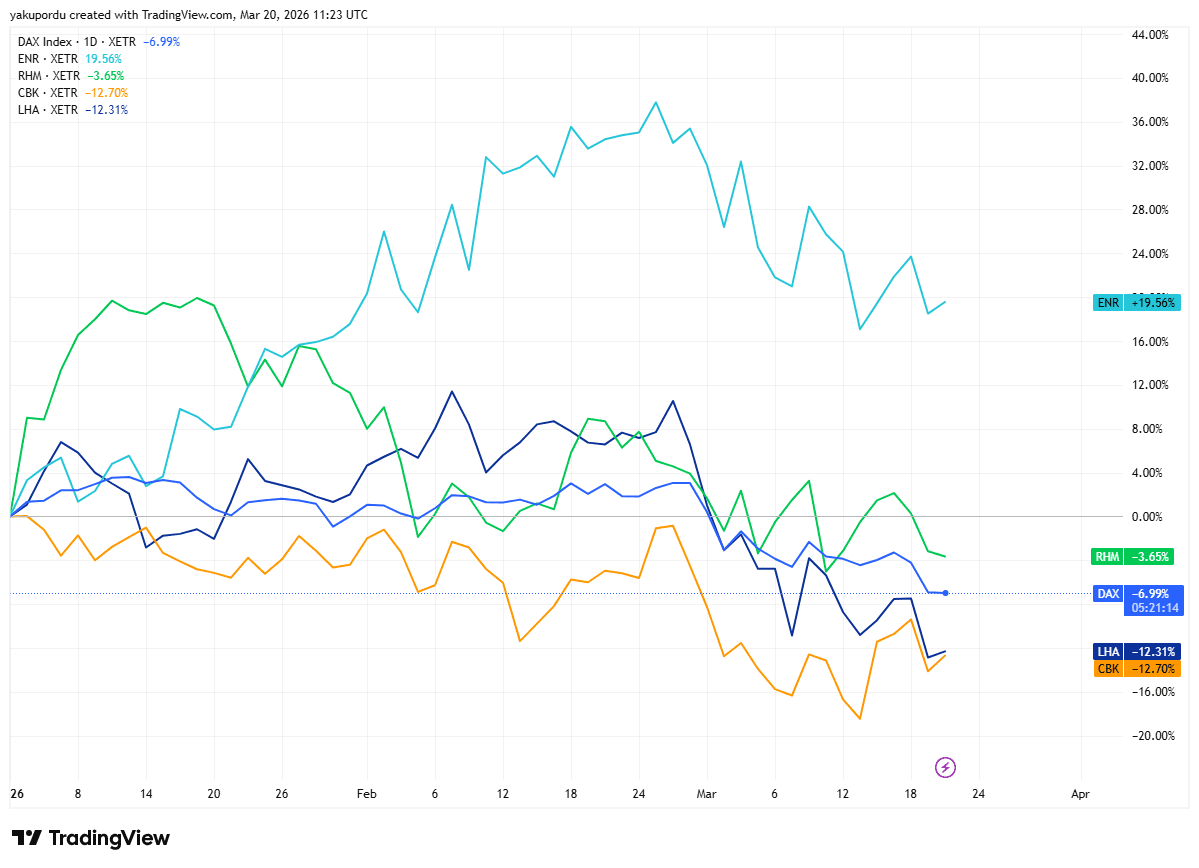 Siemens Energy war bis Mitte Februar mit über 38 % der unangefochtene Spitzenreiter im DAX. Seitdem hat der Titel fast die Hälfte dieser Gewinne abgegeben und steht YTD noch bei knapp +20 %. Kein anderer Wert zeigt so deutlich, wie tief der Makroschock in den Index eingreift.