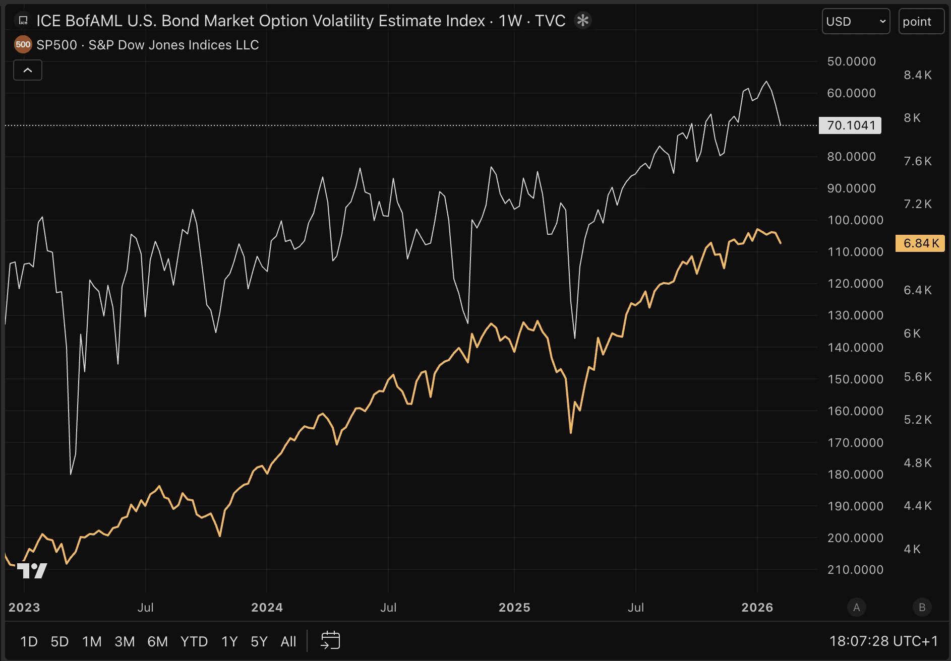 Dass Bitcoin derzeit unter Druck steht, ist kaum verwunderlich. In letzter Zeit beobachten wir nämlich eine zunehmende Volatilität auf dem Markt für US-Staatsanleihen, was in der untenstehenden Grafik durch den Fall der weißen Linie ersichtlich wird.