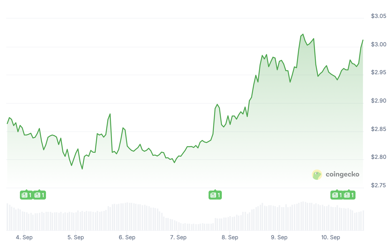Zum Zeitpunkt des Schreibens steht der XRP-Kurs genau bei 3 Dollar, ein Anstieg von 4,5 Prozent über die letzten sieben Tage. Die Münze unternimmt nun einen ernsthaften Versuch, dieses Preisniveau – das zuvor noch als Widerstand diente – in eine Unterstützung umzuwandeln. Gelingt das, dann gibt es Raum für eine neue Aufwärtsbewegung.