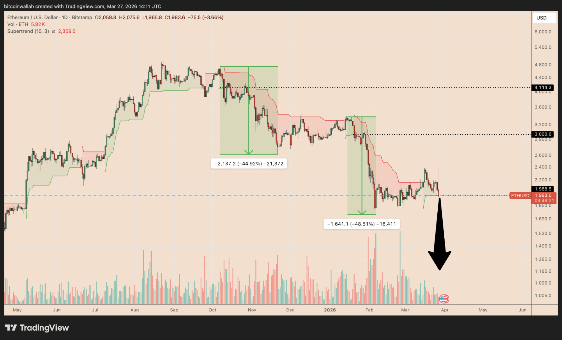 „Jetzt bildet sich dieselbe Situation bei rund 1.990 Dollar“, so der Analyst. „Wenn dieses Niveau bricht, liegt das nächste Ziel bei etwa 1.200 Dollar.“