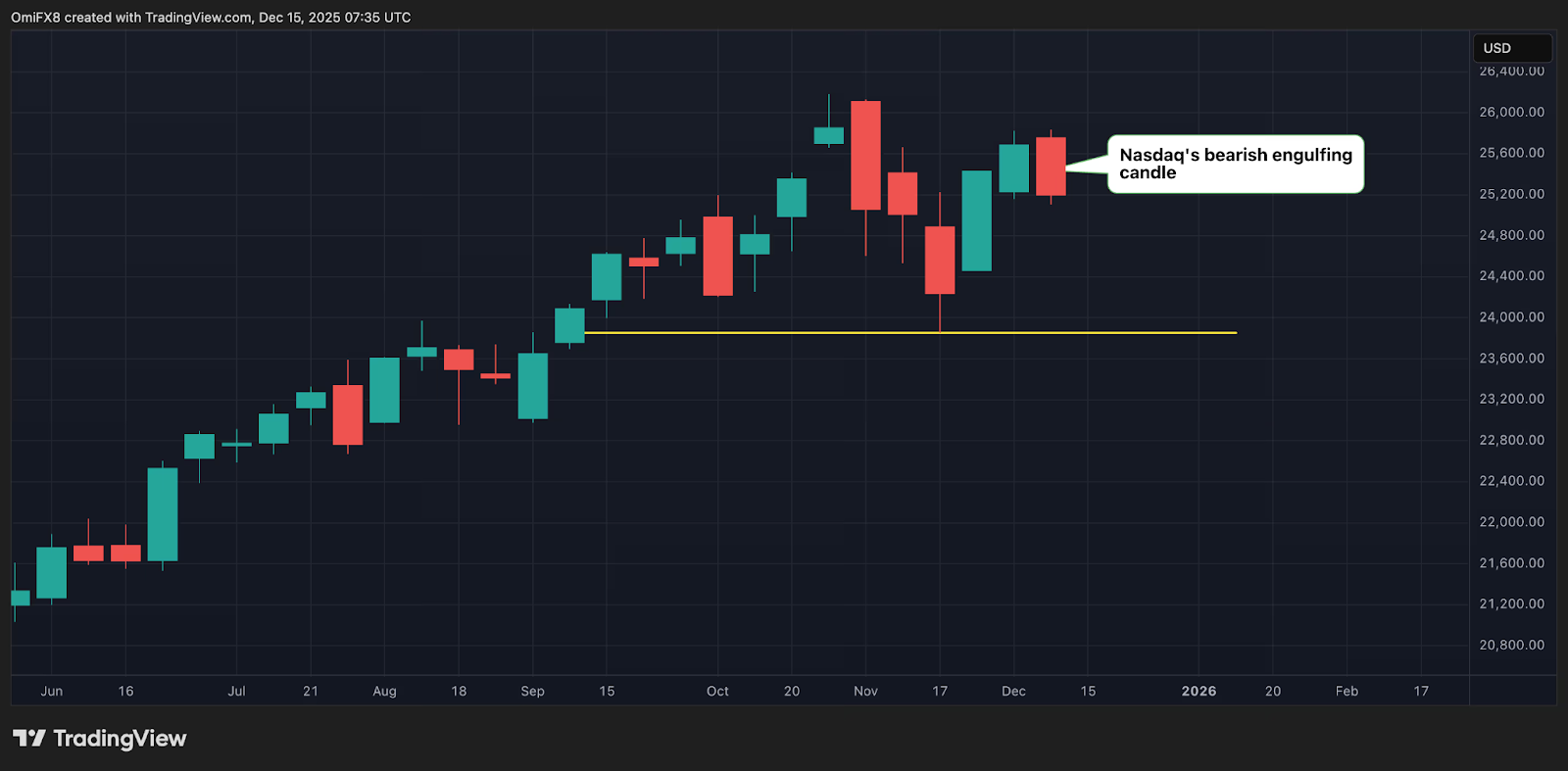Anleger betrachten die Nasdaq besorgt. Am Freitag fiel der Index um 1,9 Prozent. Zudem bildete sich ein sogenanntes bearish ‚Engulfing Candle‘ auf dem Wochenchart. Bei diesem technischen Signal ist zunächst eine kleine grüne (steigende) Kerze zu sehen, gefolgt von einer größeren roten (fallenden) Kerze, die die vorige vollständig überschattet. Einfach gesagt deutet dies auf einen möglichen Trendumschwung nach unten hin.