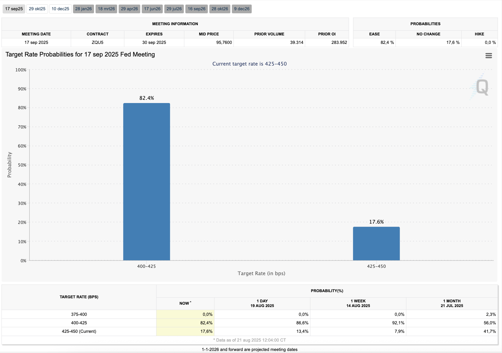 Das bleibt jedoch fraglich, da sich in den wirtschaftlichen Daten keine klaren Gründe dafür finden lassen. Dennoch sieht der Markt weiterhin eine Wahrscheinlichkeit von 82,4 Prozent für eine Zinssenkung im September.