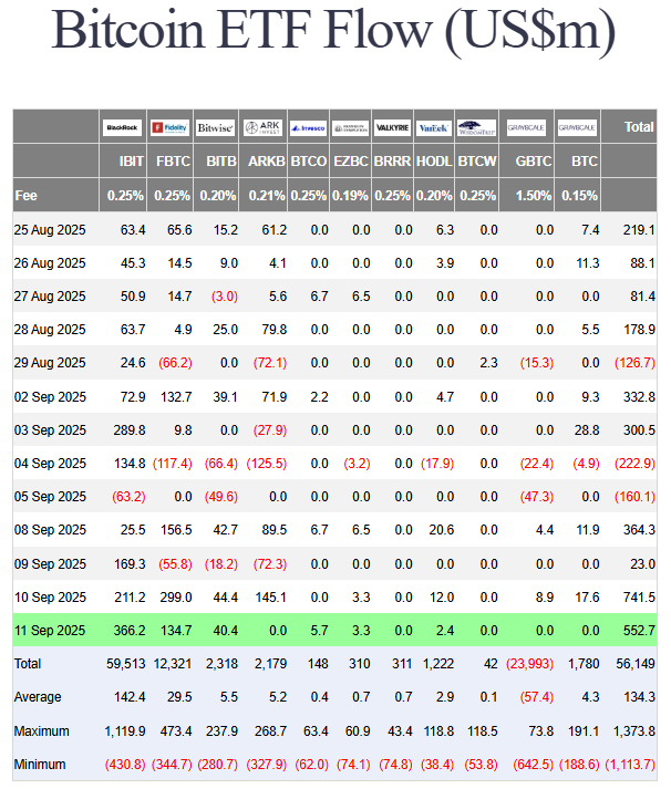 Der Bitcoin-Kurs ist heute über 115.000 Dollar gestiegen und die Bullen scheinen langsam aufzuwachen. Das sehen wir auch auf dem ETF-Markt in den Vereinigten Staaten. Dort realisierte Bitcoin gestern wieder einen beeindruckenden Zufluss von 552,7 Millionen Dollar, während es bei Ethereum um 113,1 Millionen Dollar ging.