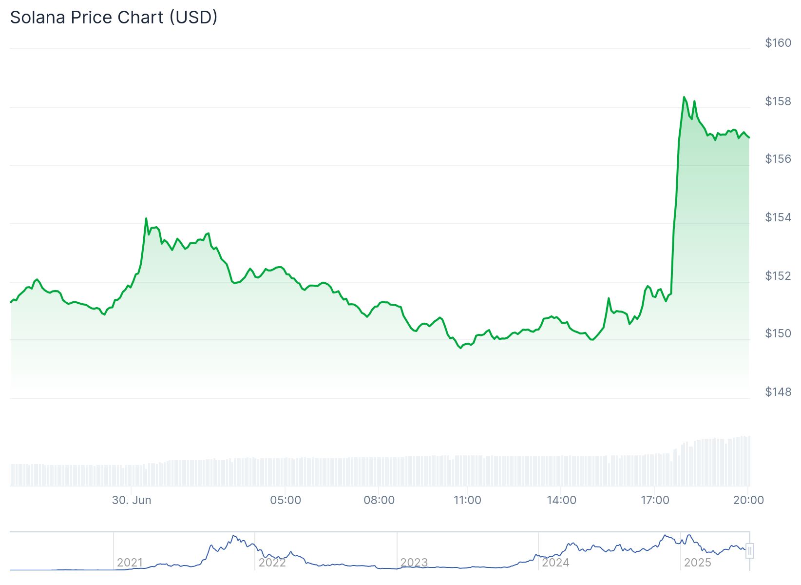 Als Folge der Nachrichten sehen wir, dass der SOL-Kurs nach oben schießt. Unmittelbar nach den Nachrichten explodierte der Preis von knapp über 151 Dollar auf einen lokalen Höhepunkt von 159 Dollar. Das ist ein Anstieg von 5,3 Prozent in nur einer halben Stunde.