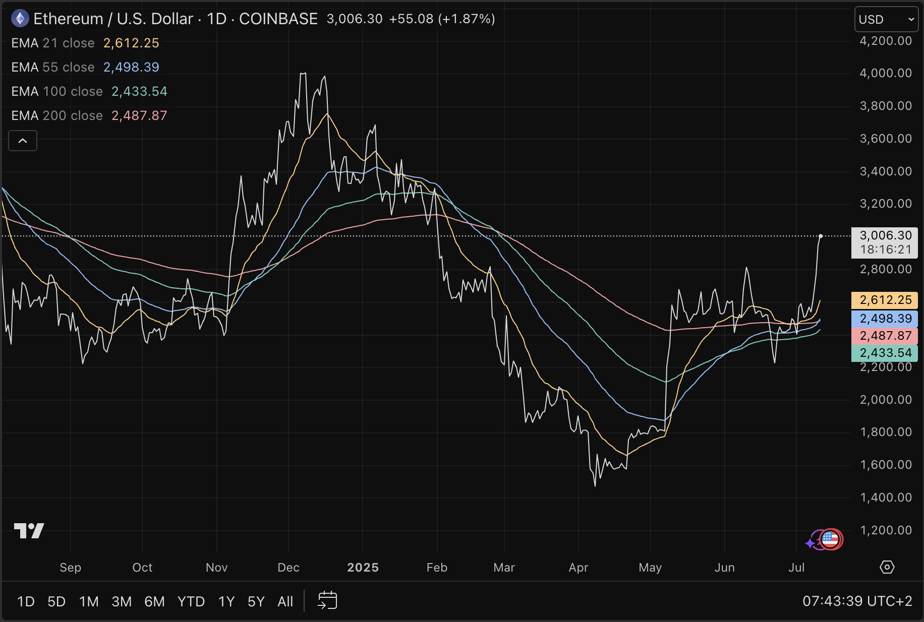 Technisch gesehen beginnt das Momentum für Ethereum besser zu werden. Mittlerweile handelt der Kurs über dem gesamten EMA-Fächer auf dem täglichen Chart. Das ist die folgende Reihe von exponentiellen gleitenden Durchschnitten (21-Tage, 55-Tage, 100-Tage und 200-Tage).