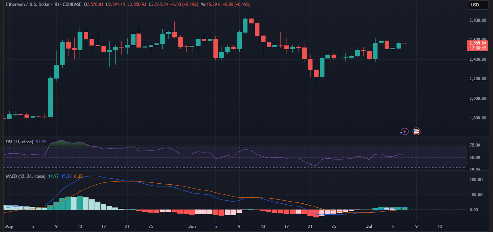 ETH steht derzeit knapp über 2.560 Dollar. Der RSI liegt bei etwa 55, was auf einen neutralen Markt hindeutet. Obwohl ETH seit Mai, abgesehen von einem kurzen Ausflug auf 2.100 Dollar, seitwärts tendiert, könnte ein zunehmendes Kaufvolumen zu einem Ausbruch auf 2.800 Dollar führen.