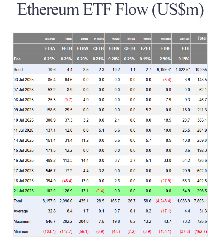 Laut Daten von Farside verzeichneten die Bitcoin Spot-Fonds am Montag einen Abfluss von 131,4 Millionen Dollar. Im Gegensatz dazu erlebten die Ethereum ETFs einen Nettozufluss von sage und schreibe 296,5 Millionen Dollar. Zudem ist dies bereits der zwölfte Handelstag in Folge, an dem die ETH-Fonds einen positiven Zufluss verzeichnen. Insgesamt gab es in diesem Zeitraum einen Nettozufluss von über 3 Milliarden Dollar.