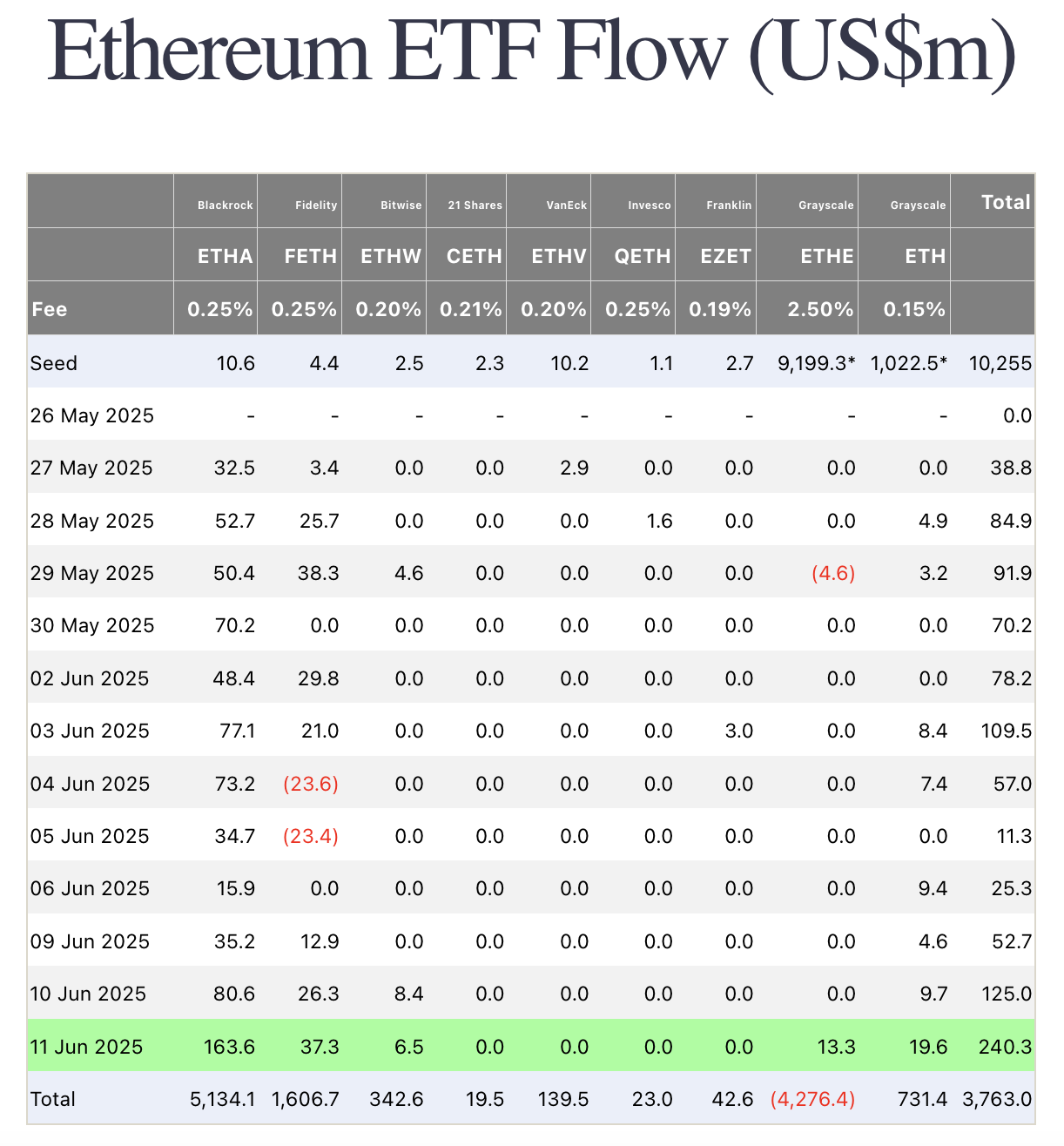Ethereum Spot-ETFs erhielten am Mittwoch 240,3 Millionen Dollar an Nettozuflüssen, das siebthöchste Tagesergebnis seit der Einführung der Fonds. Damit schnitt Ethereum erneut besser ab als die Bitcoin-ETFs, die am gleichen Tag 164,5 Millionen Dollar anzogen.