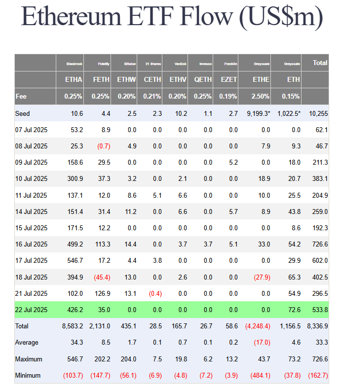 Die Kapitalströme zeigen deutlich, wo der Fokus liegt. Ethereum ETFs zogen gestern 533,8 Millionen Dollar an, während Bitcoin ETFs einen Abfluss von 68 Millionen verzeichneten, laut Zahlen von Farside.