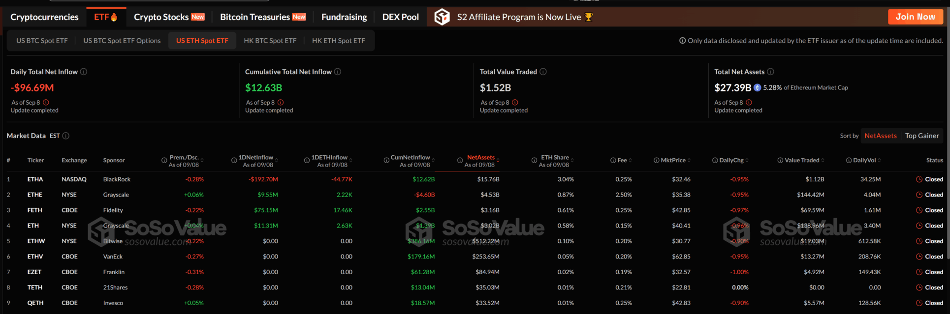 Am Freitag allein wurden 446,7 Millionen Dollar abgezogen. Letzten Montag wurden weitere 96,7 Millionen Dollar abgezogen. Vor allem der Fonds von BlackRock (ETHA) verzeichnete einen starken Abfluss, während die Fonds von Fidelity und Grayscale kleine Zuflüsse verzeichneten.