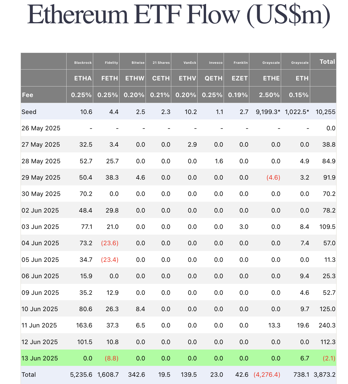 Nach einer Rekordserie von neunzehn Tagen mit Zuflüssen sahen die Ethereum (ETH) Exchange-Traded Funds (ETFs) am Freitag erstmals wieder einen Abfluss. Der Rückgang fällt zusammen mit einer neuen Welle geopolitischer Unruhen, die Druck auf den Kryptomarkt ausüben.