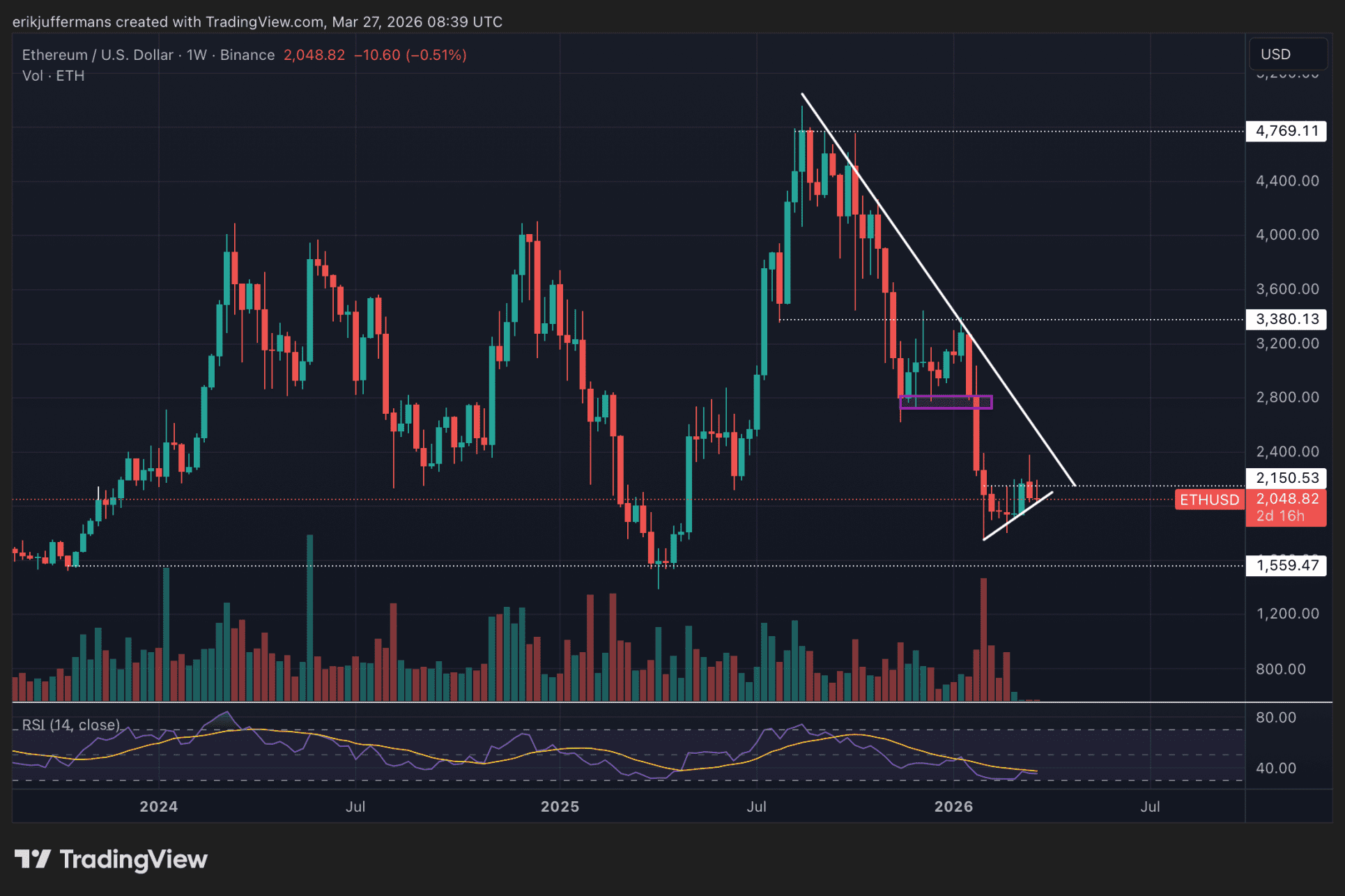 Der Kryptomarkt wirkt fragil. Es gelang Bitcoin (BTC) in dieser Woche nicht, über der wichtigen Marke von 70.000 Dollar zu bleiben, was auch Auswirkungen auf den Rest des Marktes hat. Obwohl Ethereum (ETH) weiterhin über der Marke von 2.000 Dollar handelt, könnte sich das laut dem technischen Analysten Erik Juffermans von Newsbit schnell ändern.