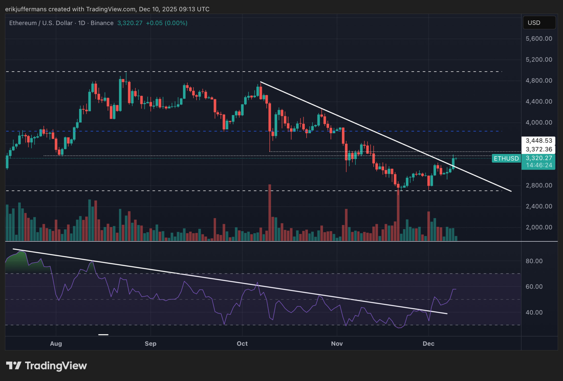 Auf dem untenstehenden täglichen ETH-Chart sehen wir, dass der Kurs gestern die Abwärtstrendlinie durchbrochen hat. In unserer vorherigen Analyse hatten wir geschrieben, dass dies ein guter erster Schritt zur Erholung wäre. Mit der starken Kerze von gestern sehen wir dies nun eintreten.