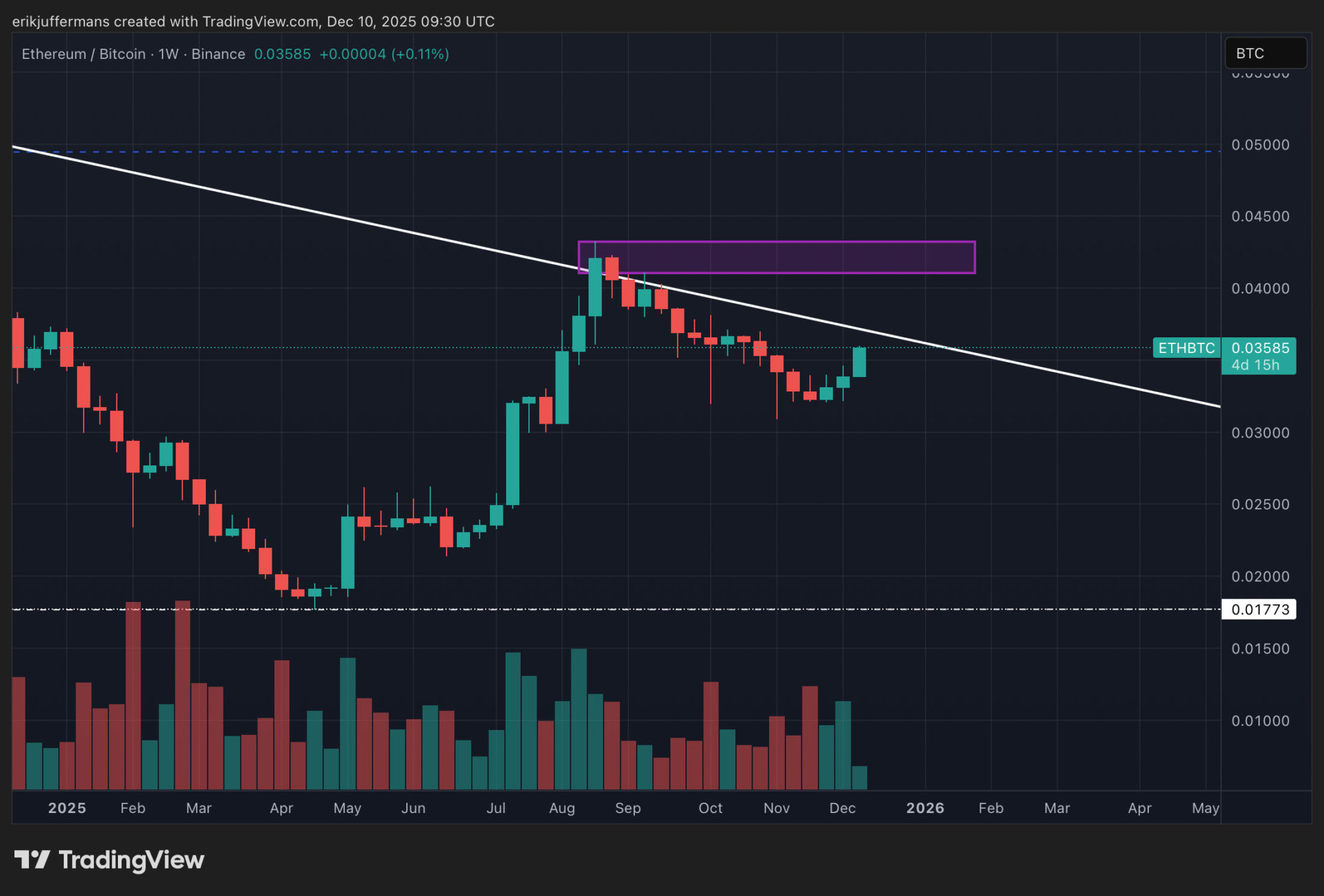 Der eigentliche Test kommt auf dem Niveau über 0,040. Dies ist das im August verzeichnete jüngste Hoch. Ein wöchentlicher Schluss darüber würde den neuen Trend wirklich bestätigen. Aber zunächst die diagonale Trendlinie. Und ETH/BTC nähert sich ihr stetig.
