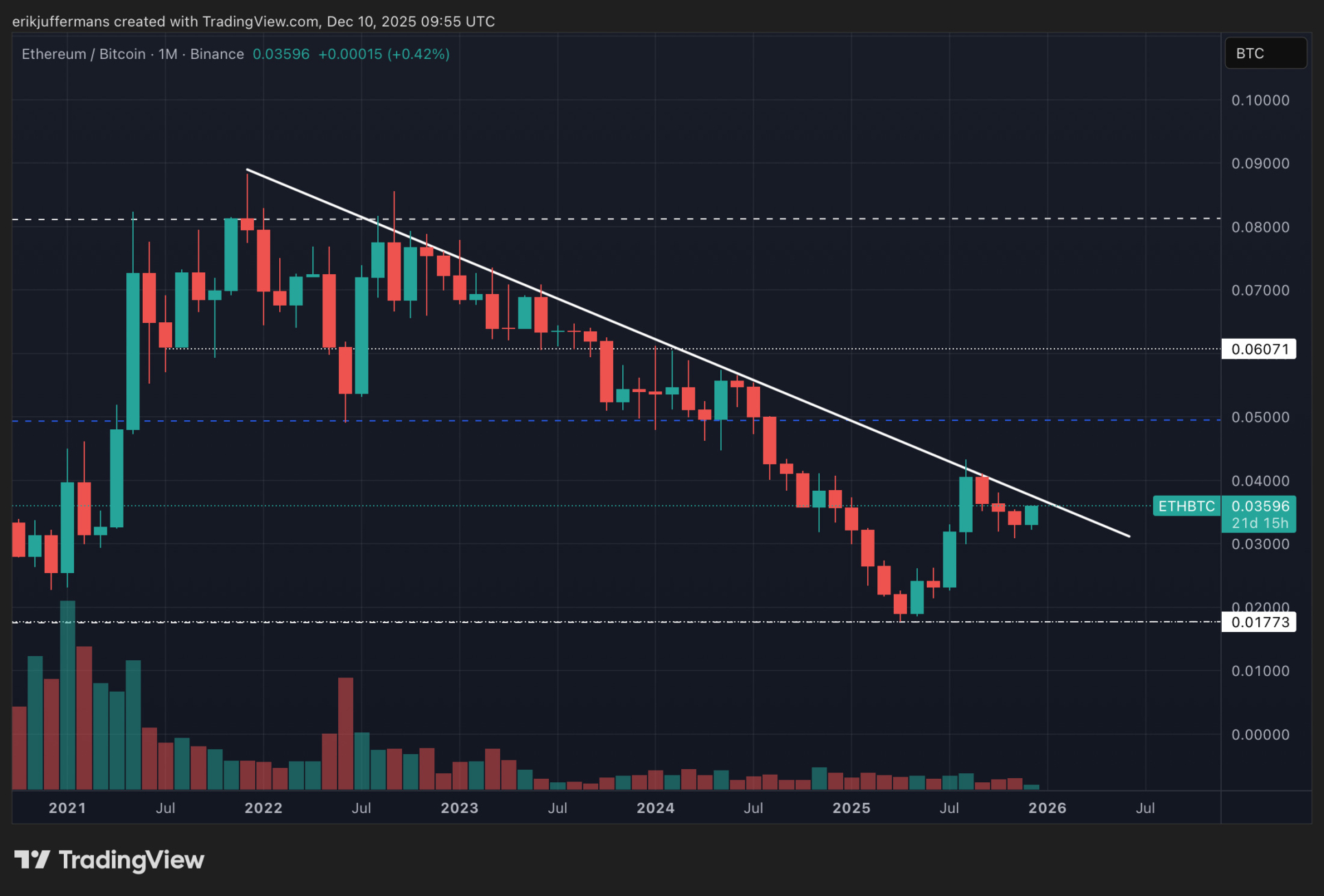 Werfen wir einen Blick auf den ETH/BTC-Chart, denn es wird spannend. Diese Grafik zeigt, wie viel ETH im Vergleich zu BTC wert ist. Derzeit etwa 0,036.