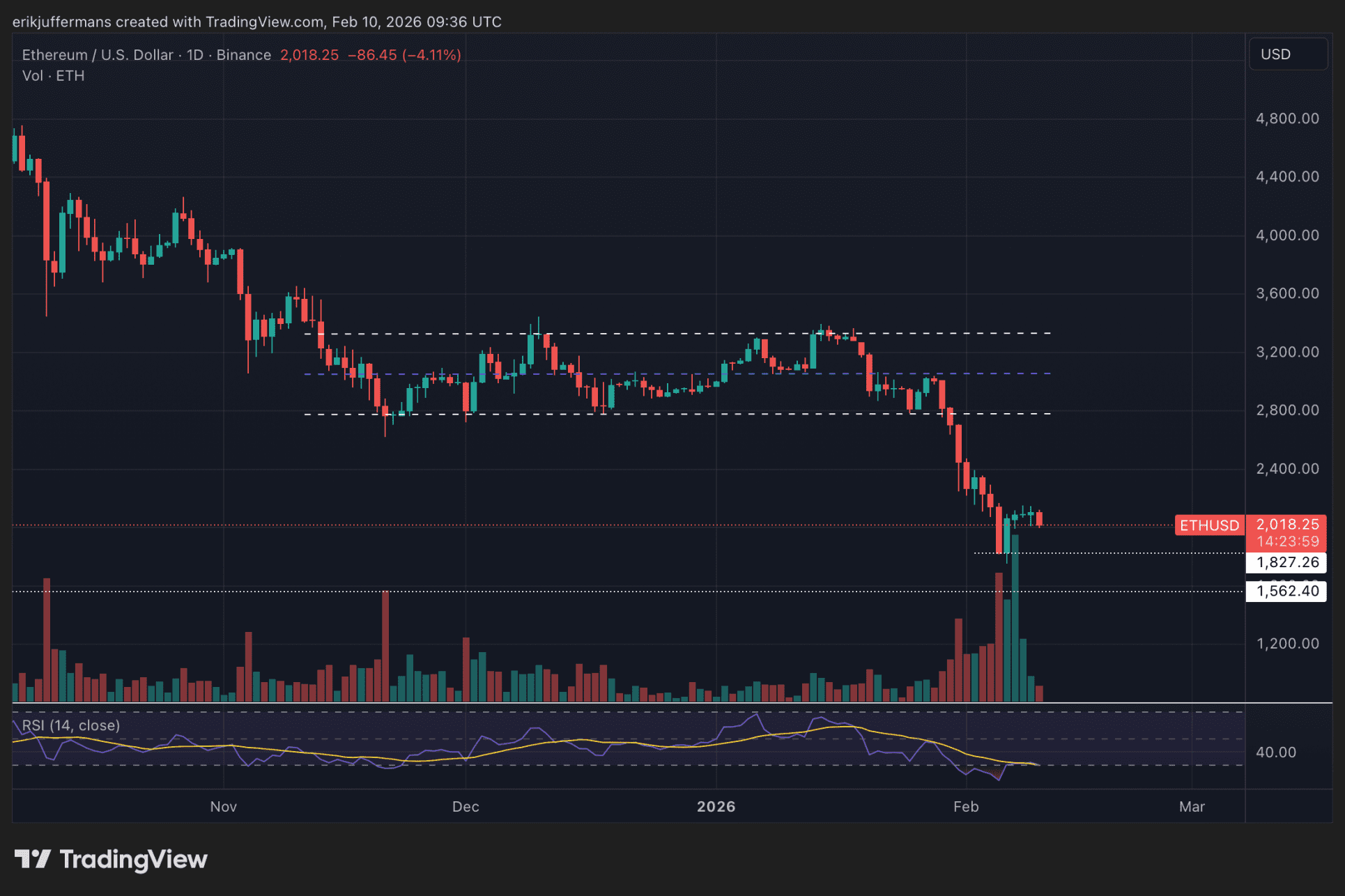 Der ETH-Kurs scheint sich momentan knapp über der 2.000-Dollar-Marke zu halten, einem wichtigen psychologischen Niveau. Kürzlich fiel der Kurs nahe an die 1.800-Dollar-Grenze zurück, wobei der tägliche RSI ebenfalls stark nachgab.