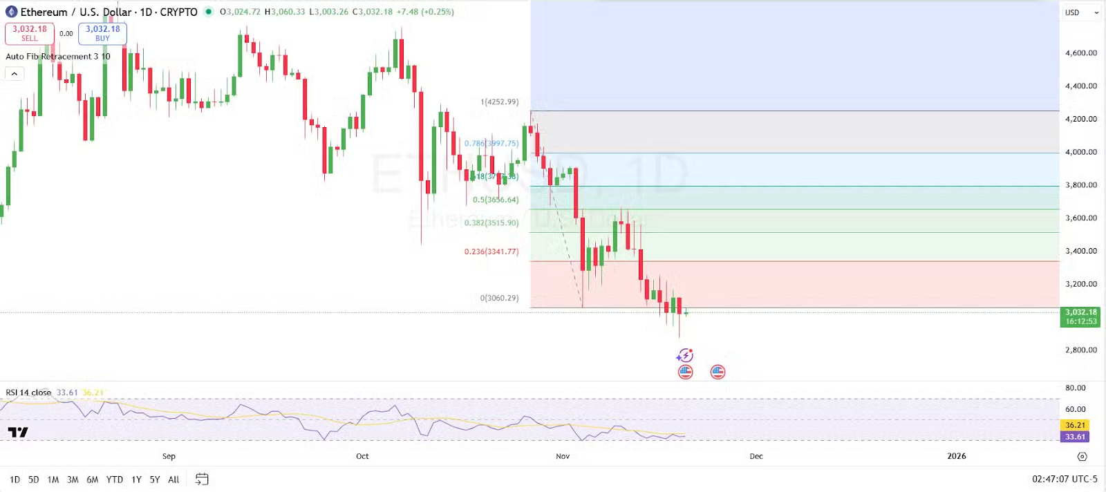 Laut Analyst Albert Brown zeigt Ethereum derzeit ein geschwächtes technisches Bild. Der Kurs ist zum Zeitpunkt des Schreibens auf rund 3.010 US-Dollar gefallen und befindet sich auf 7-Tage-Sicht in einem Abwärtstrend mit einem Minus von 14 Prozent.