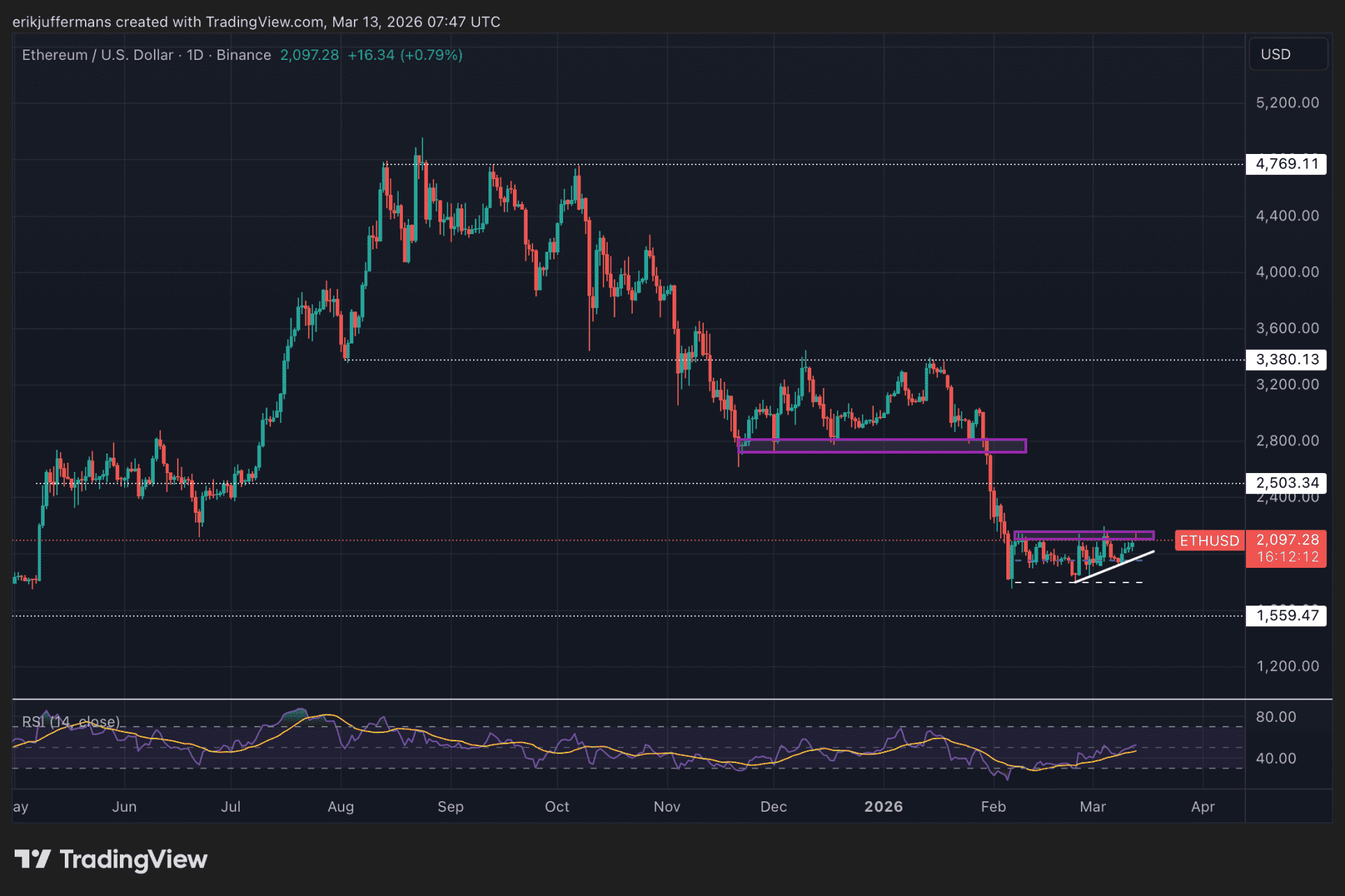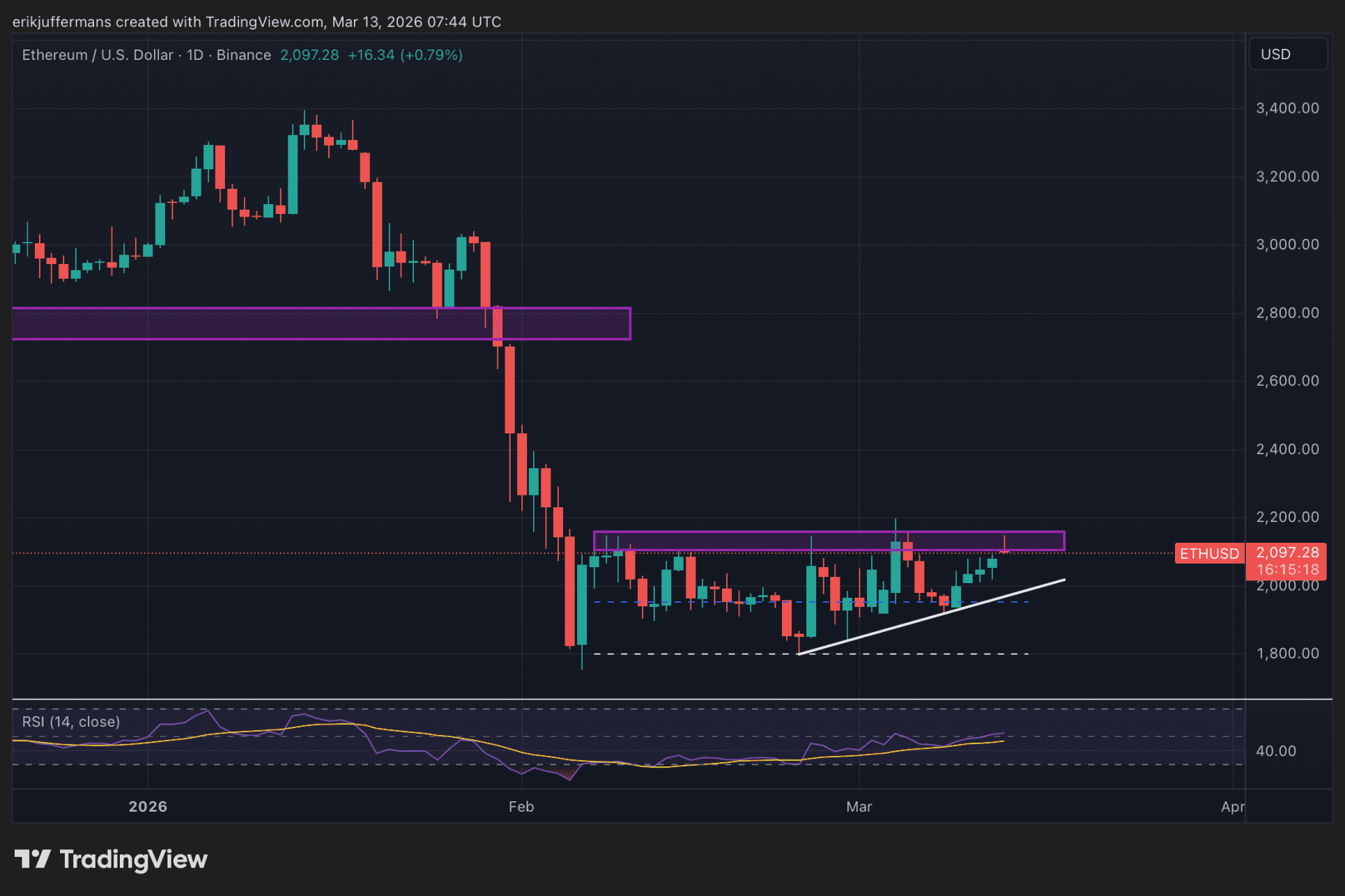 Zugleich sieht die Struktur auf dem Chart zunehmend robuster aus. Seit dem Tiefpunkt um 1.800 Dollar bildet ETH höhere Tiefs und baut langsam Momentum in Richtung des Widerstands auf. Dies könnte darauf hindeuten, dass der Verkaufsdruck allmählich nachlässt.