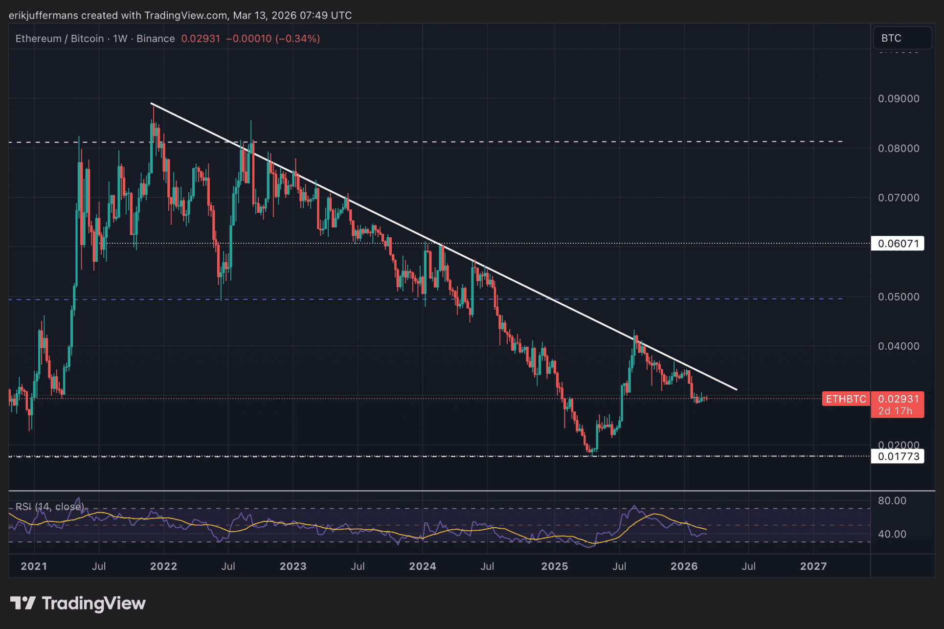 Abschließend ist es interessant, die ETH/BTC-Grafik zu betrachten. Dieses Verhältnis zeigt, wie Ethereum im Vergleich zu Bitcoin abschneidet.