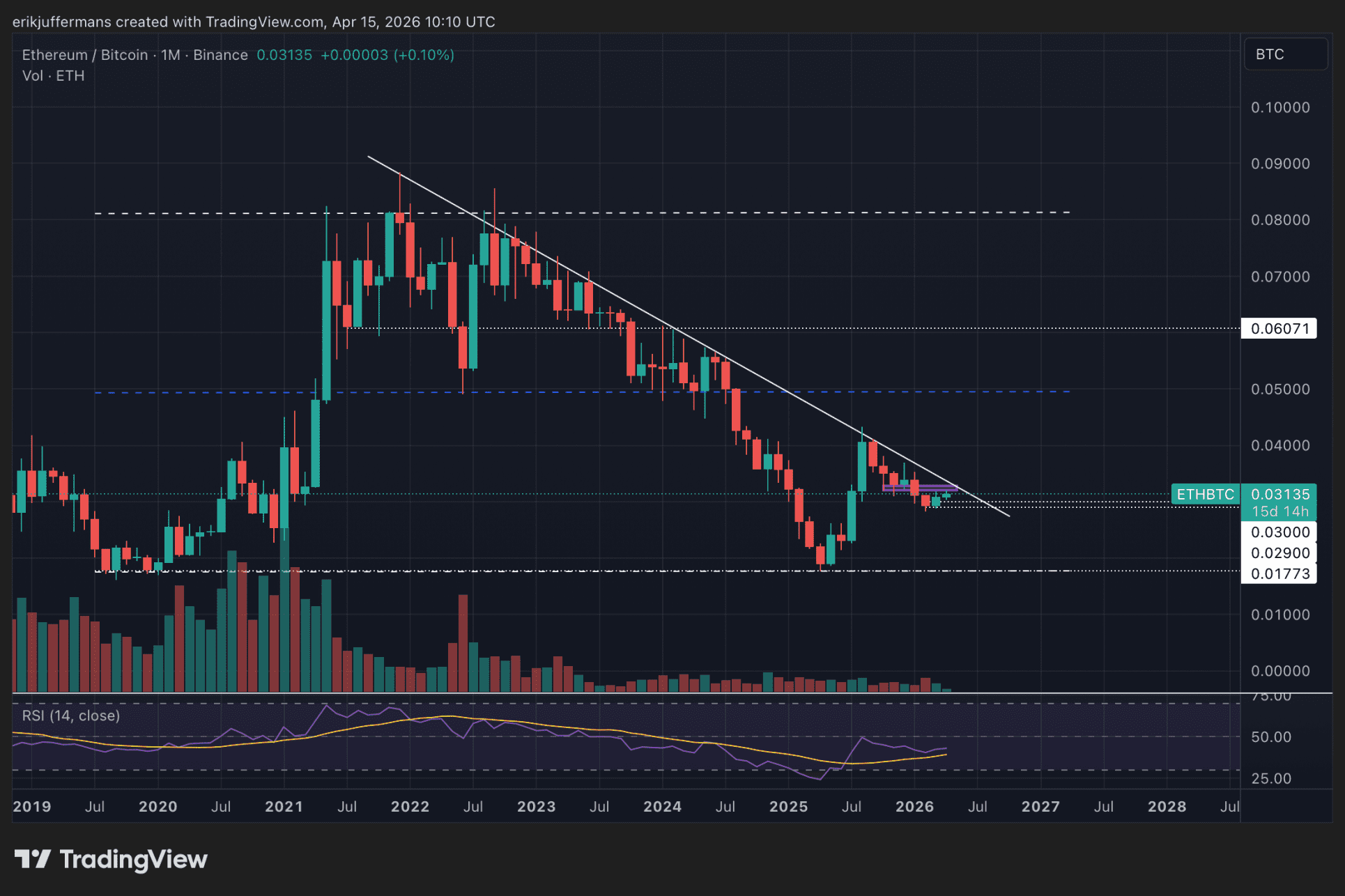 Langfristig ist das Bild klar. ETH befindet sich gegenüber BTC seit Jahren in einem starken Abwärtstrend. Ein Durchbrechen der Abwärtstrendlinie wäre ein sehr starkes Signal. In diesem Fall wäre das Niveau von 0,050 ein erster Halt. Derzeit liegt der ETH/BTC-Wert bei etwa 0,031.