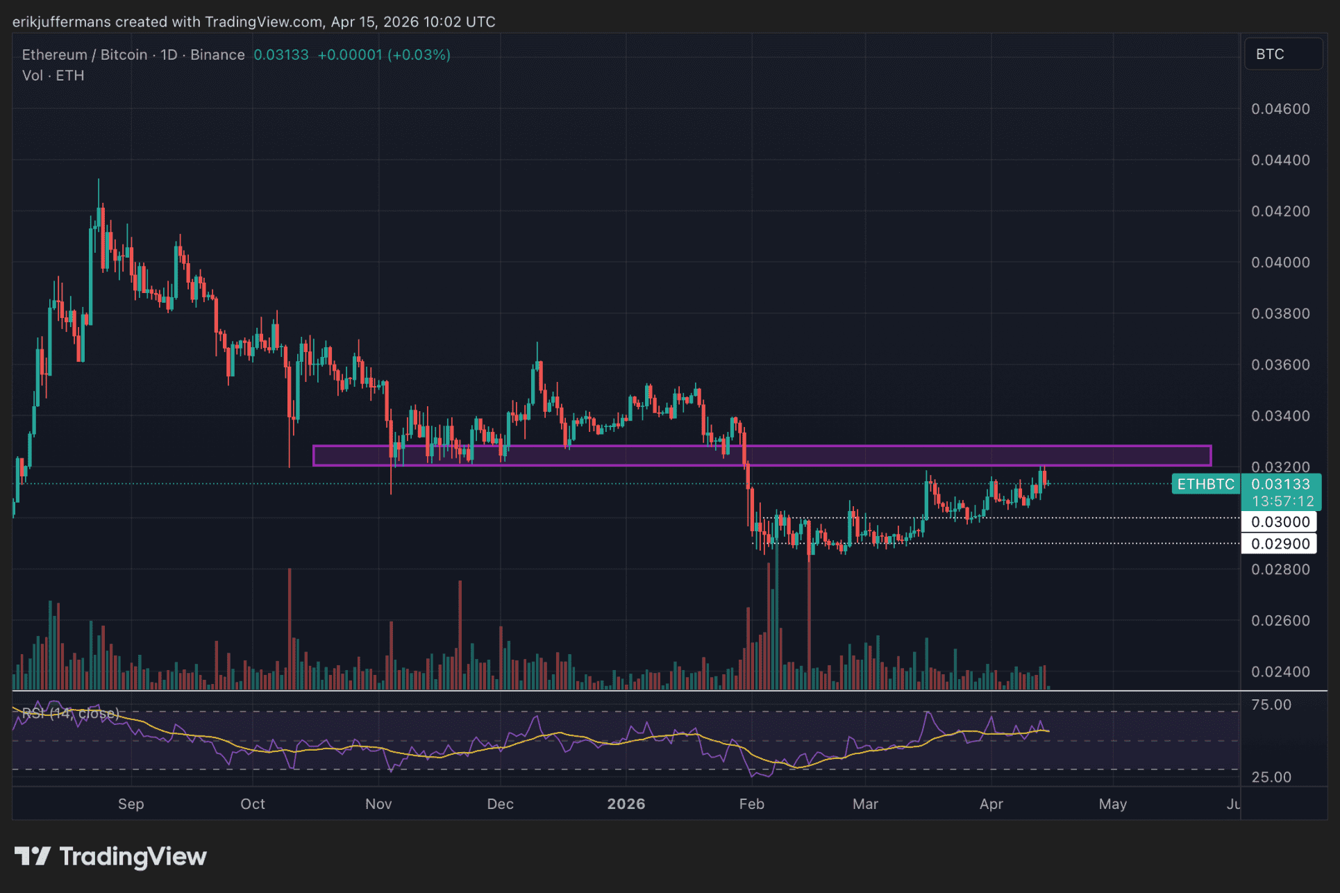 Gleichzeitig stieg der Wert von ETH gegenüber BTC auf das höchste Niveau seit Januar. Die Grafik zeigt derzeit jedoch deutlichen Widerstand, wie in der untenstehenden Grafik zu sehen ist.