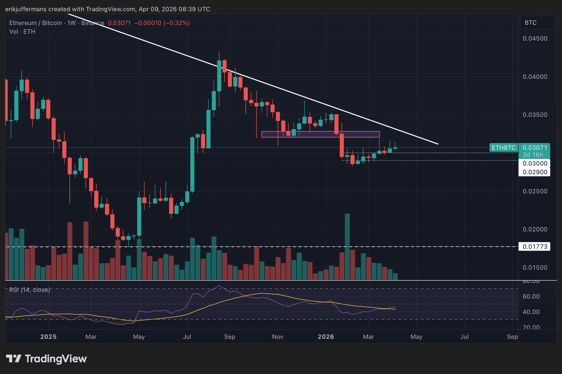 Wir müssen auch verstärkt die ETH/BTC-Grafik im Auge behalten. ETH befindet sich seit Ende 2021 in einem Abwärtstrend gegenüber Bitcoin. Doch seit dem vergangenen Sommer flirtet ETH deutlich mit dieser abwärtsführenden Widerstandslinie. Bisher bleibt es ein Warten auf diesen Ausbruch. Dies wäre nach fast fünf Jahren das erste starke Signal, dass ETH einer längeren Wachstumsphase gegenüber BTC entgegensieht.