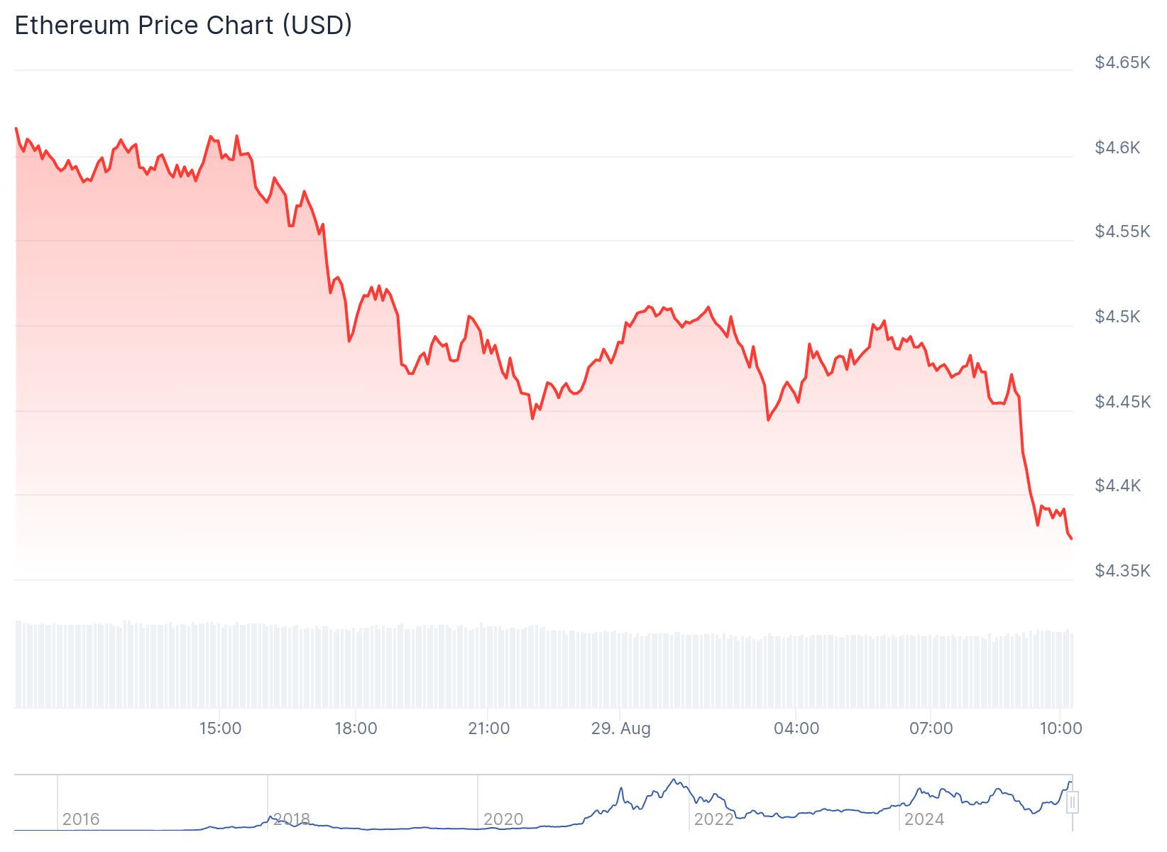 Bei den Altcoins sehen wir heute starke Verluste. Ethereum (ETH) fiel in den letzten 24 Stunden um 3,9 Prozent und steht zum Zeitpunkt des Schreibens bei 4.390 Dollar. Bemerkenswert ist, dass damit fast alle Gewinne der letzten Woche ausgelöscht wurden. Der ETH-Kurs nähert sich sogar dem Tiefpunkt von genau einer Woche zuvor.