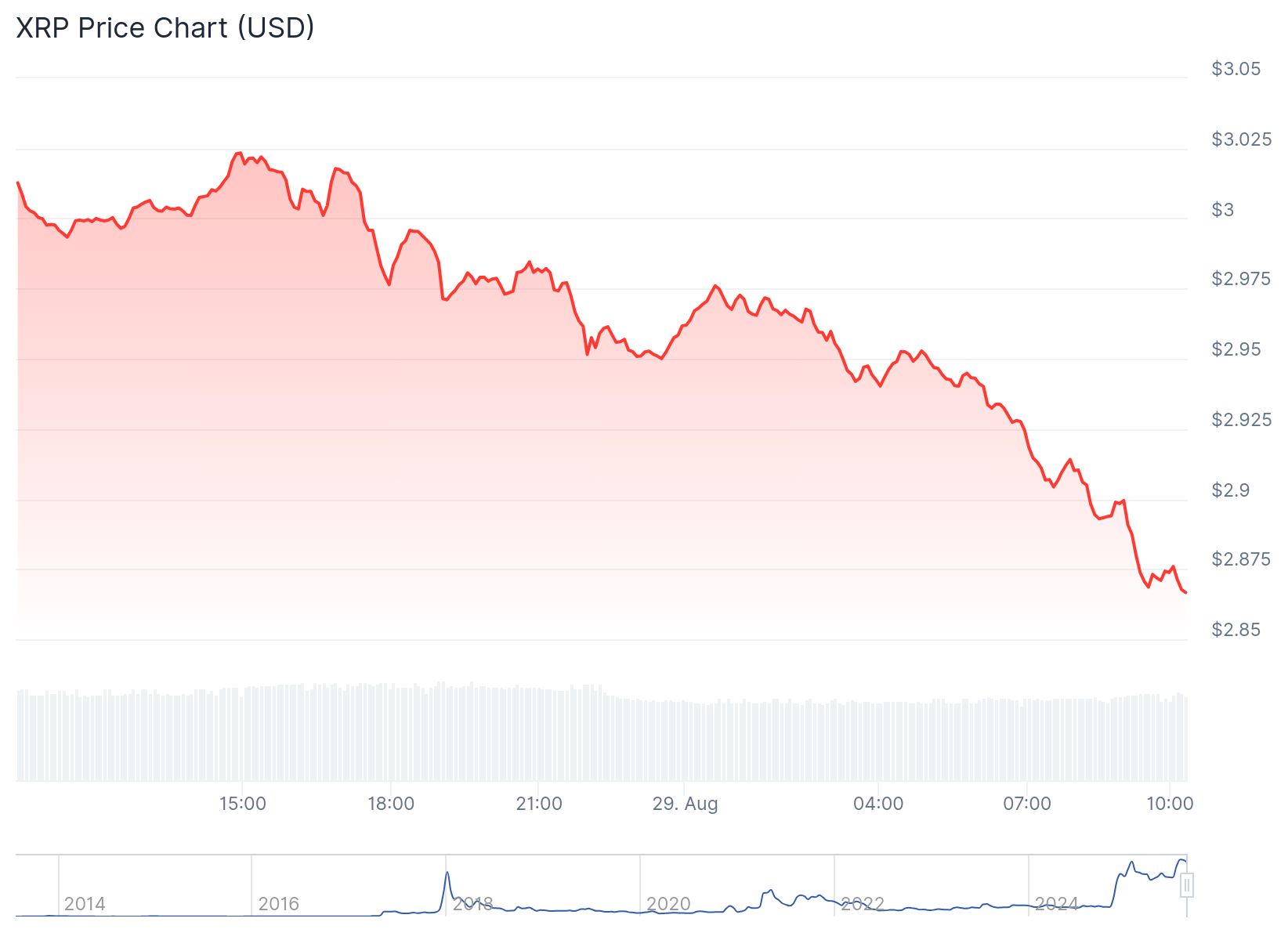 Bei XRP sind die Verluste noch größer. In den letzten 24 Stunden verzeichnet die digitale Währung einen Rückgang von 4,2 Prozent. Mit einem aktuellen Preis von 2,87 Dollar ist der Token mittlerweile stark unter das Unterstützungsniveau von 3 Dollar gefallen, über dem er gestern noch gehandelt wurde.