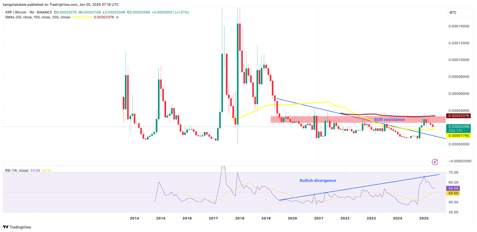 Auch die Kursentwicklung von XRP im Vergleich zu Bitcoin (BTC) zeigt ein positives Bild. Seit 2019 hat das XRP/BTC-Diagramm niedrigere Höchststände gebildet, während der monatliche RSI von 41 auf 67 gestiegen ist. Diese widersprüchlichen Bewegungen deuten auf eine bullish Divergenz hin, ein klassisches Zeichen dafür, dass der Verkaufsdruck nachlässt und ein Aufwärtsdurchbruch bevorstehen könnte.