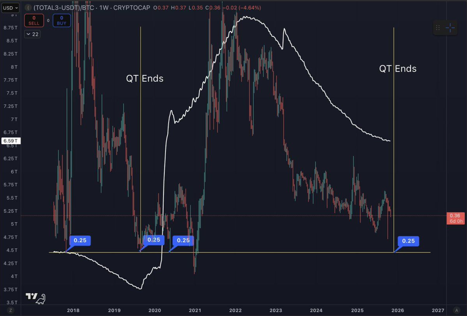 Ein weiterer wichtiger technischer Referenzwert ist die ALT/BTC-Ratio. In früheren Marktzyklen bildete diese Kennzahl häufig ein Tief im Bereich von 0,25, als QT endete. Diese Zone fungiert als wichtige Unterstützung und gilt als möglicher Startpunkt einer Altseason.