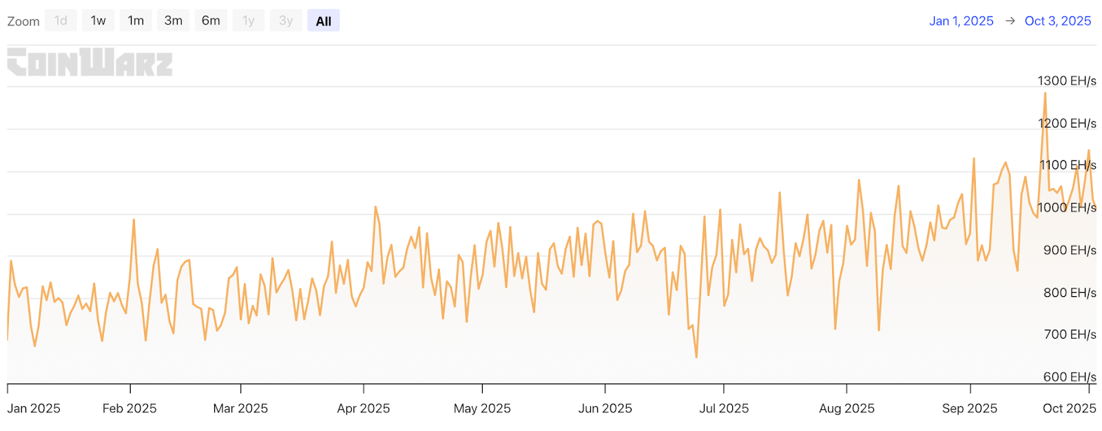 Der Wettbewerb unter Bitcoin-Minern nimmt in diesem Jahr zudem weiter zu. Laut Daten von CoinWarz stieg die Hashrate von 702,8 Exahash pro Sekunde am 1. Januar 2025 auf 1.285,7 Exahash pro Sekunde am 20. September 2025.