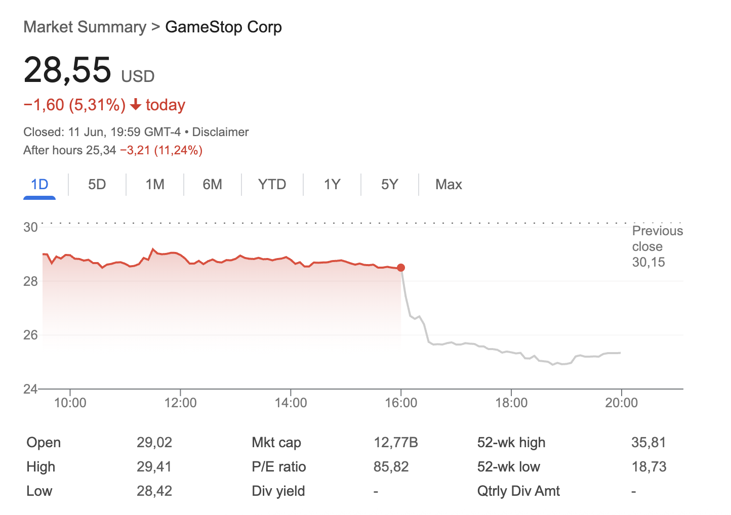 Übrigens war gestern nicht der beste Tag in der Geschichte von GameStop. Der Aktienkurs fiel um 5,31%. Das hat wahrscheinlich etwas mit dem plötzlichen Kursrückgang zu tun, den Bitcoin gestern erlebte. Im nachbörslichen Handel fiel die Aktie noch einmal um 11,24%.