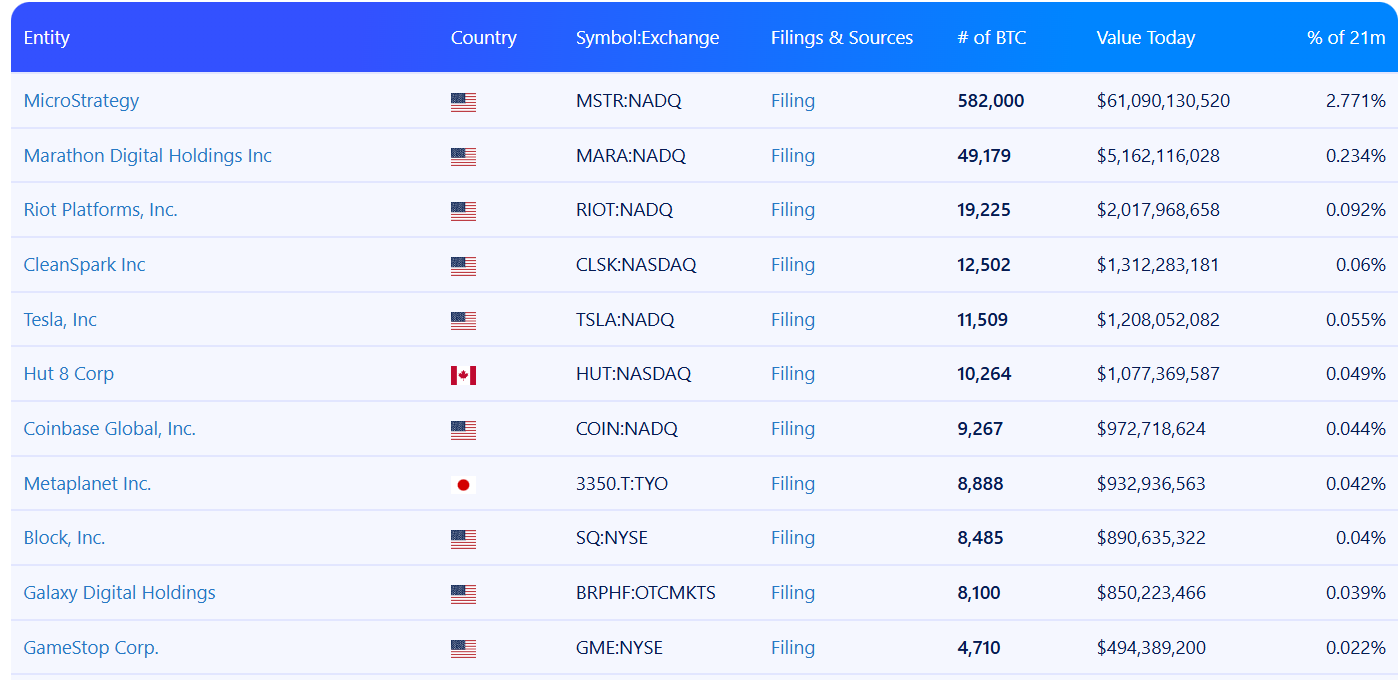 Zurzeit ist GameStop mit seinen 4.710 BTC die Nummer 11 der Welt, wenn es um börsennotierte Unternehmen mit Bitcoin geht. An erster Stelle finden wir natürlich das Strategy von Michael Saylor, gefolgt von Marathon Digital auf Platz zwei und Riot Platforms auf dem dritten Platz.