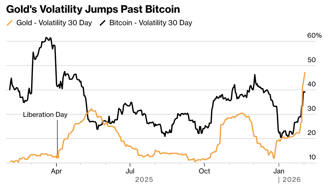 Das ist bemerkenswert. Gold gilt seit Jahrzehnten als stabile sichere Anlage, während Bitcoin für seine unberechenbaren Preisschwankungen bekannt ist. Seit der Einführung von BTC kam es nur zweimal vor, dass Gold so volatil war. Zuletzt geschah dies im Mai letzten Jahres, als Handelsspannungen nach neuen Importdrohungen von Donald Trump zunahmen.