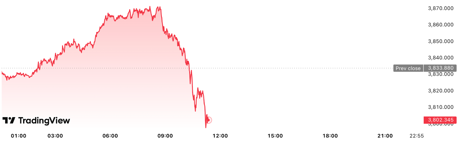 Der Goldpreis stieg im Frühhandel auf ein neues Allzeithoch von gut 3.870 Dollar je Unze (31,1 Gramm). Auf den steilen Anstieg folgte eine gesunde Korrektur; der Preis fiel auf rund 3.802 Dollar zurück. Damit notiert Gold dennoch 0,78 Prozent niedriger als am Vortag.